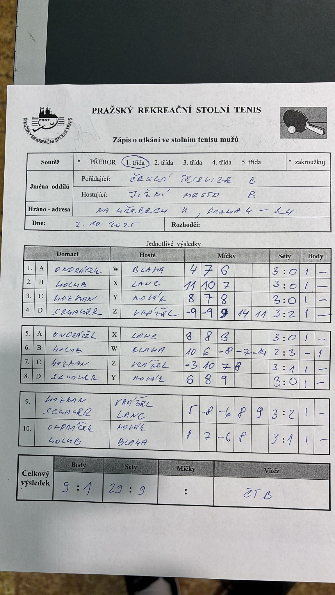 | 5/6 | Stodůlky B | Jižní Město B | 4 : 6 | út 21.10.2025 18:00 | | | 22.10.2025 11:04 milosl |