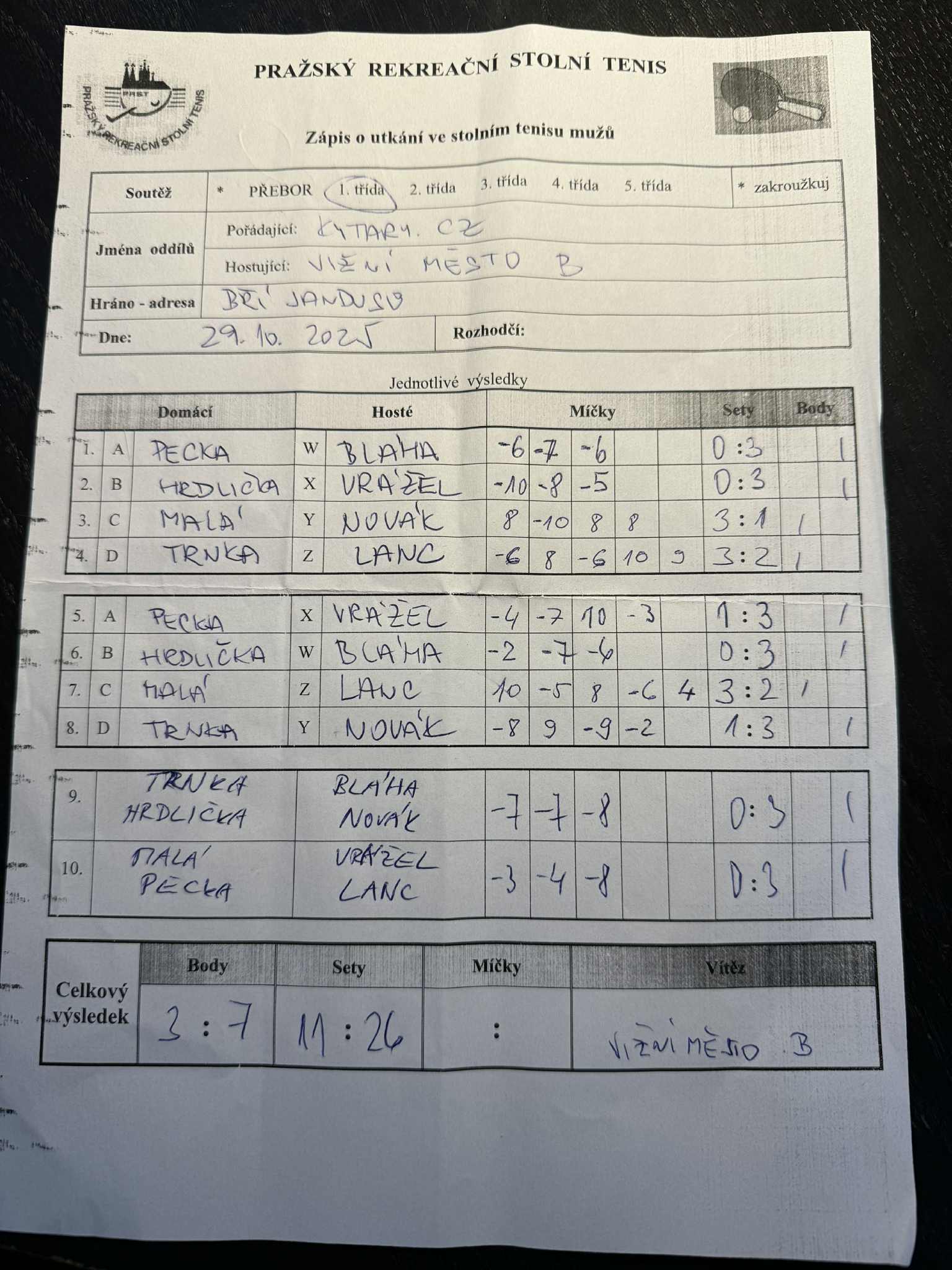 | 6/1 | Kytary.cz | Jižní Město B | 3 : 7 | st 29.10.2025 18:30 | | | 30.10.2025 10:14 vita.t |