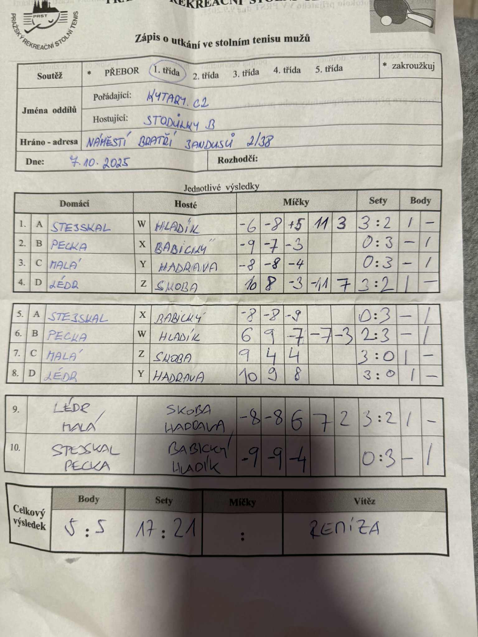 | 4/1 | Kytary.cz | Stodůlky B | 5 : 5 | út 07.10.2025 20:00 | | | 09.10.2025 18:24 vita.t |