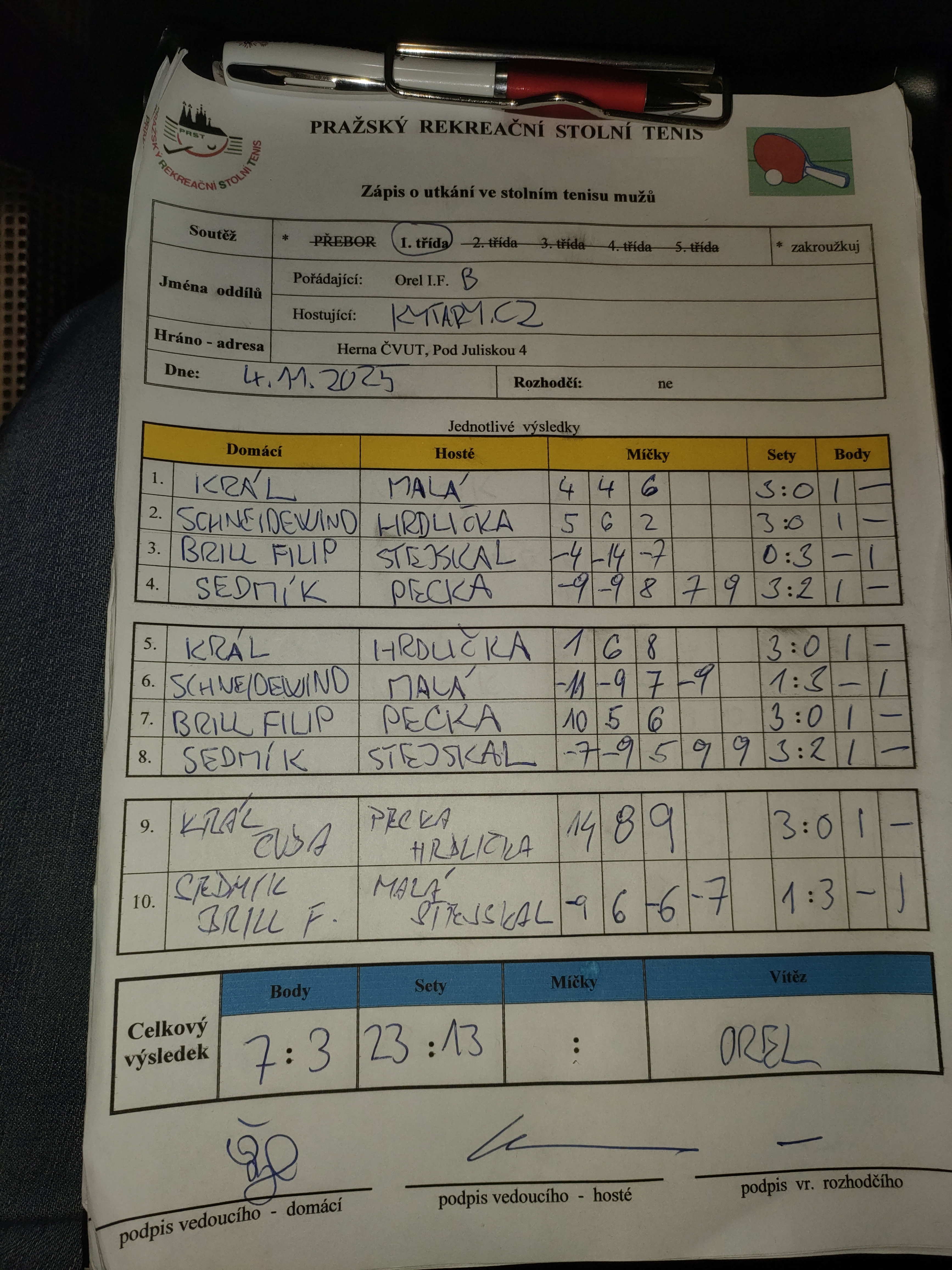 | 7/4 | Orel I.F. | Kytary.cz | 7 : 3 | út 04.11.2025 19:15 | | | 04.11.2025 23:49 jarosl |