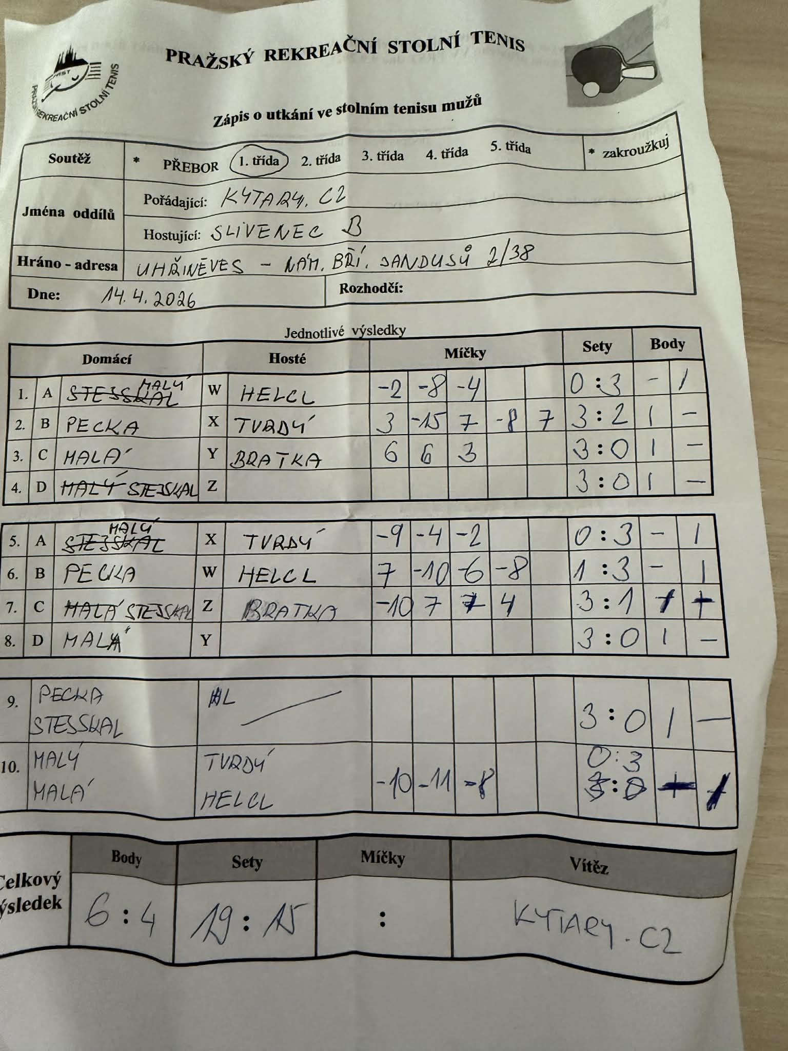 | 20/5 | Kytary.cz | Slivenec B | 6 : 4 | út 14.04.2026 20:00 | | | 21.04.2026 16:37 vita.t |