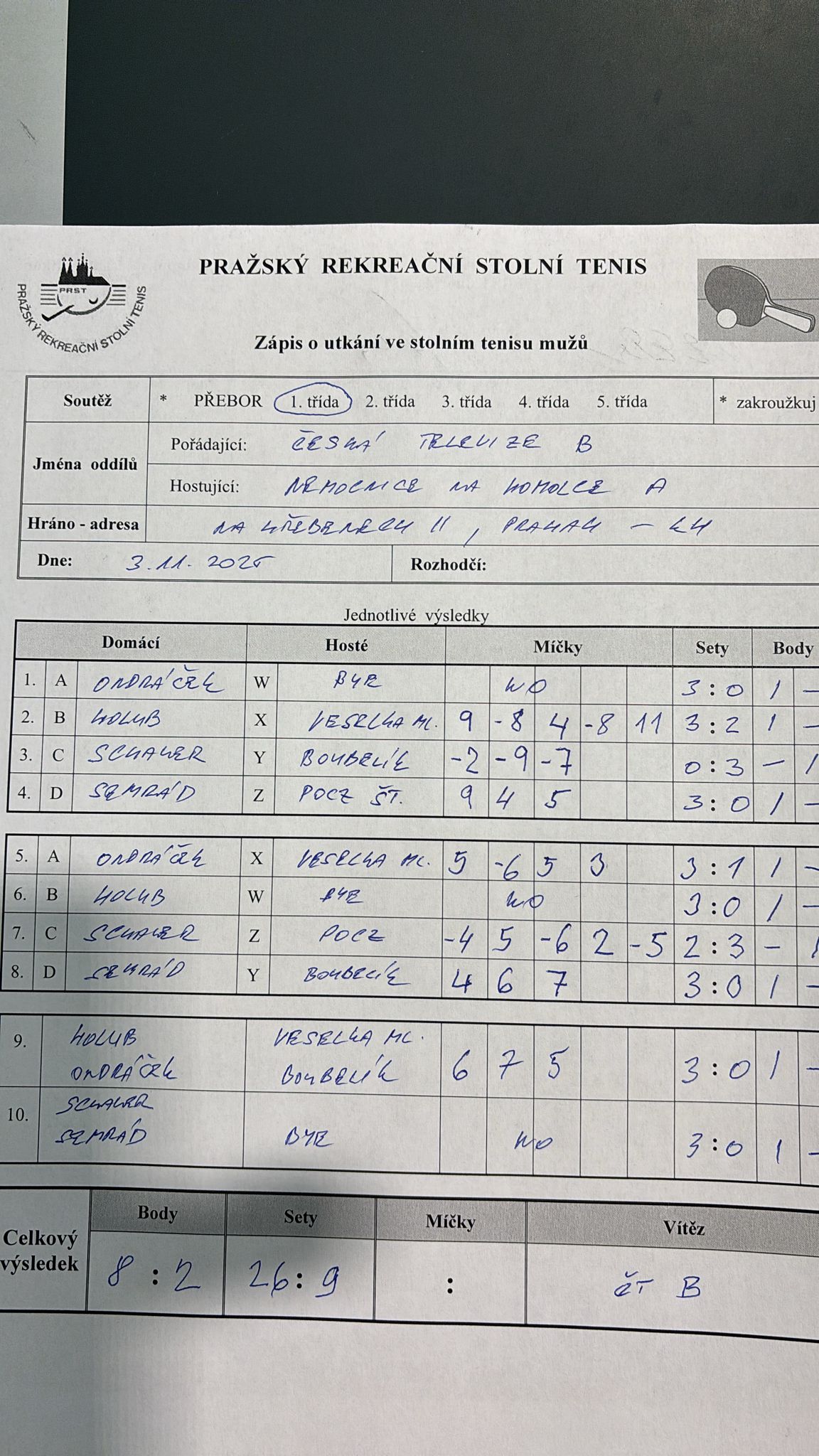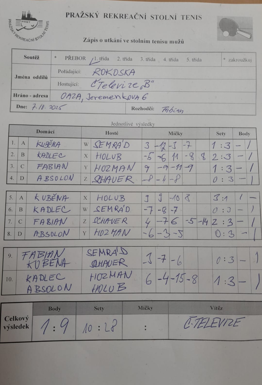 | 2/5 | Stodůlky B | Česká televize B | 5 : 5 | út 23.09.2025 18:00 | | | 23.09.2025 21:00 milosl |