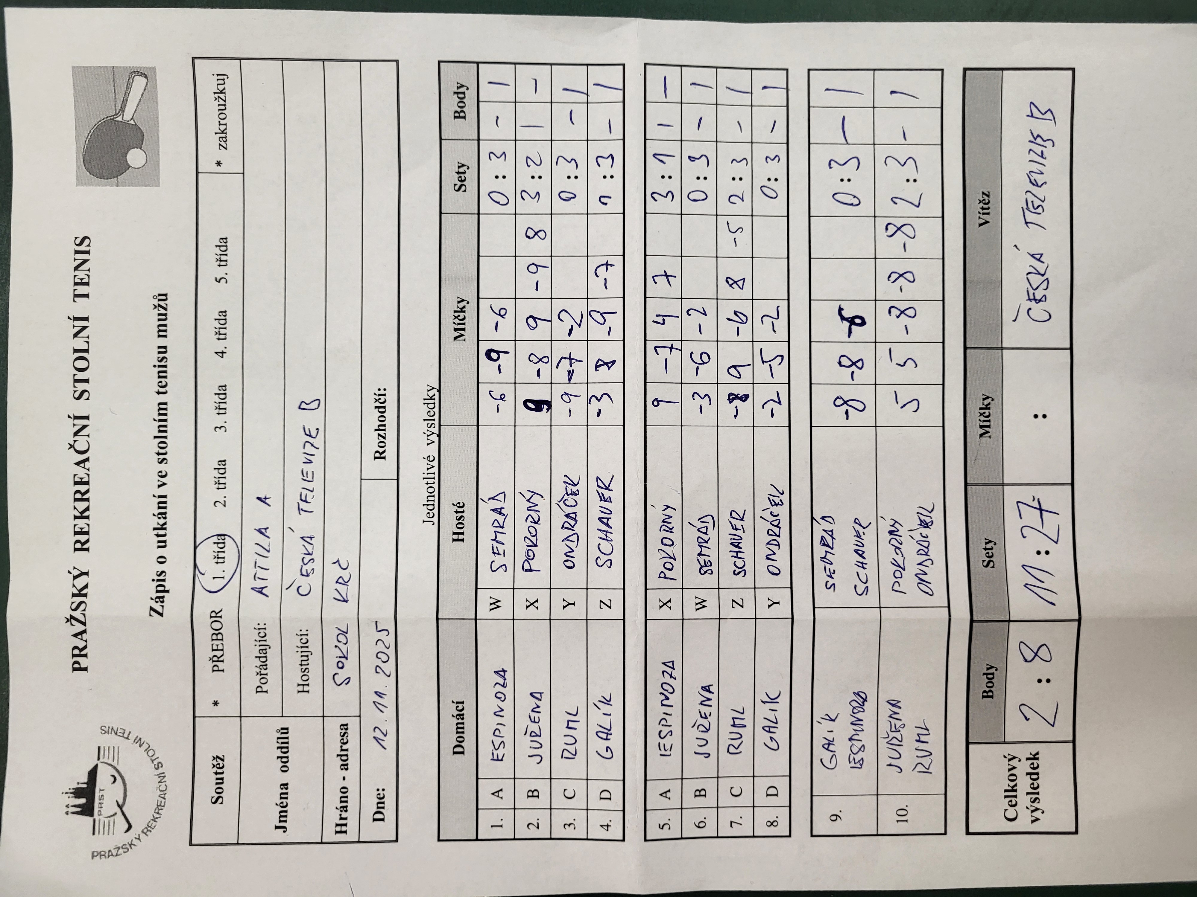 | 8/5 | Attila A | Česká televize B | 2 : 8 | st 12.11.2025 18:45 | | | 12.11.2025 20:24 ondra. |