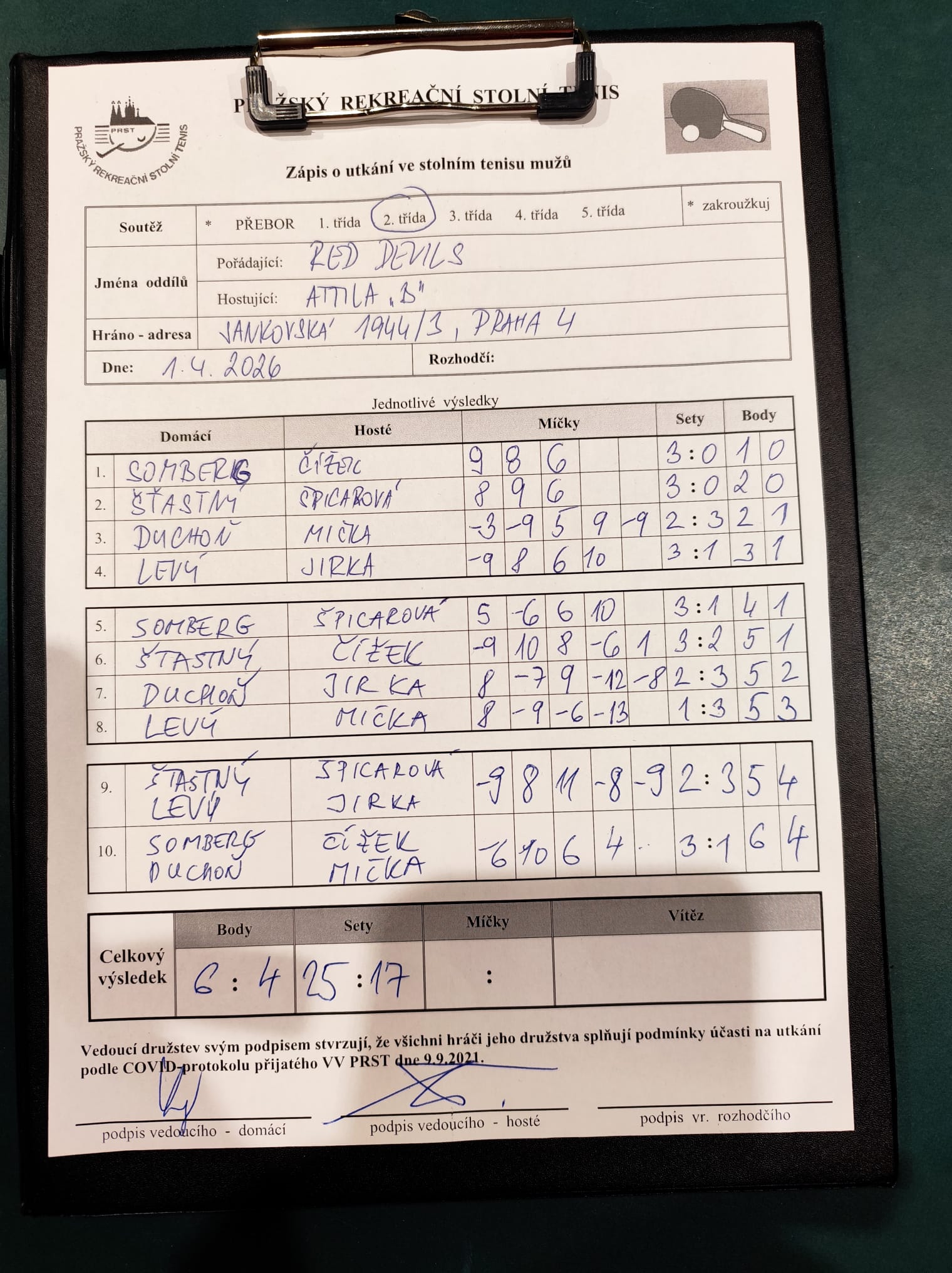 | 4 | Red Devils | Attila B | 6 : 4 | st 01.04.2026 19:00 | | | 02.04.2026 10:12 mirosl |