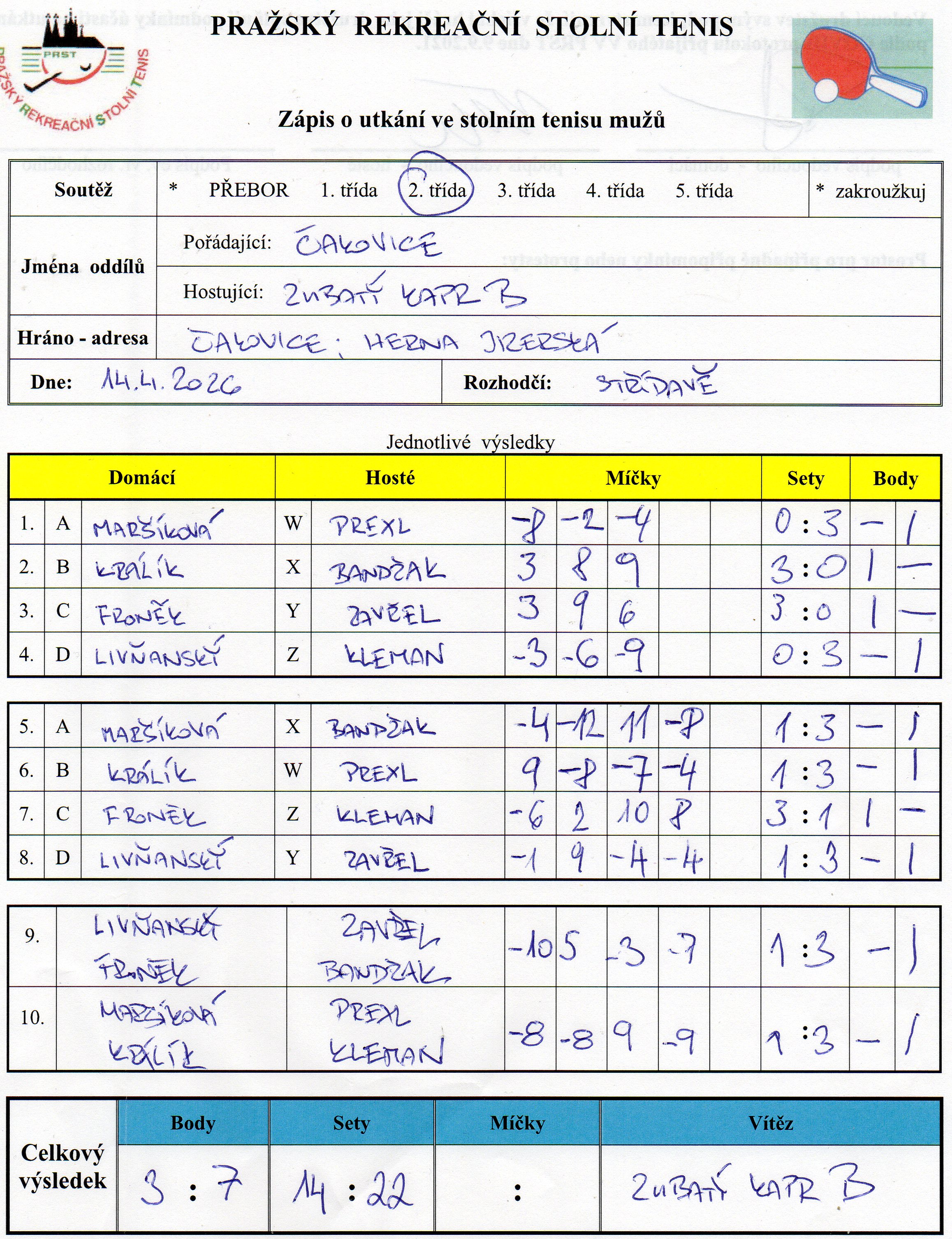 | 14/1 | Čakovice | Attila B | 3 : 7 | čt 22.01.2026 19:00 | | | 22.01.2026 21:46 livnan |