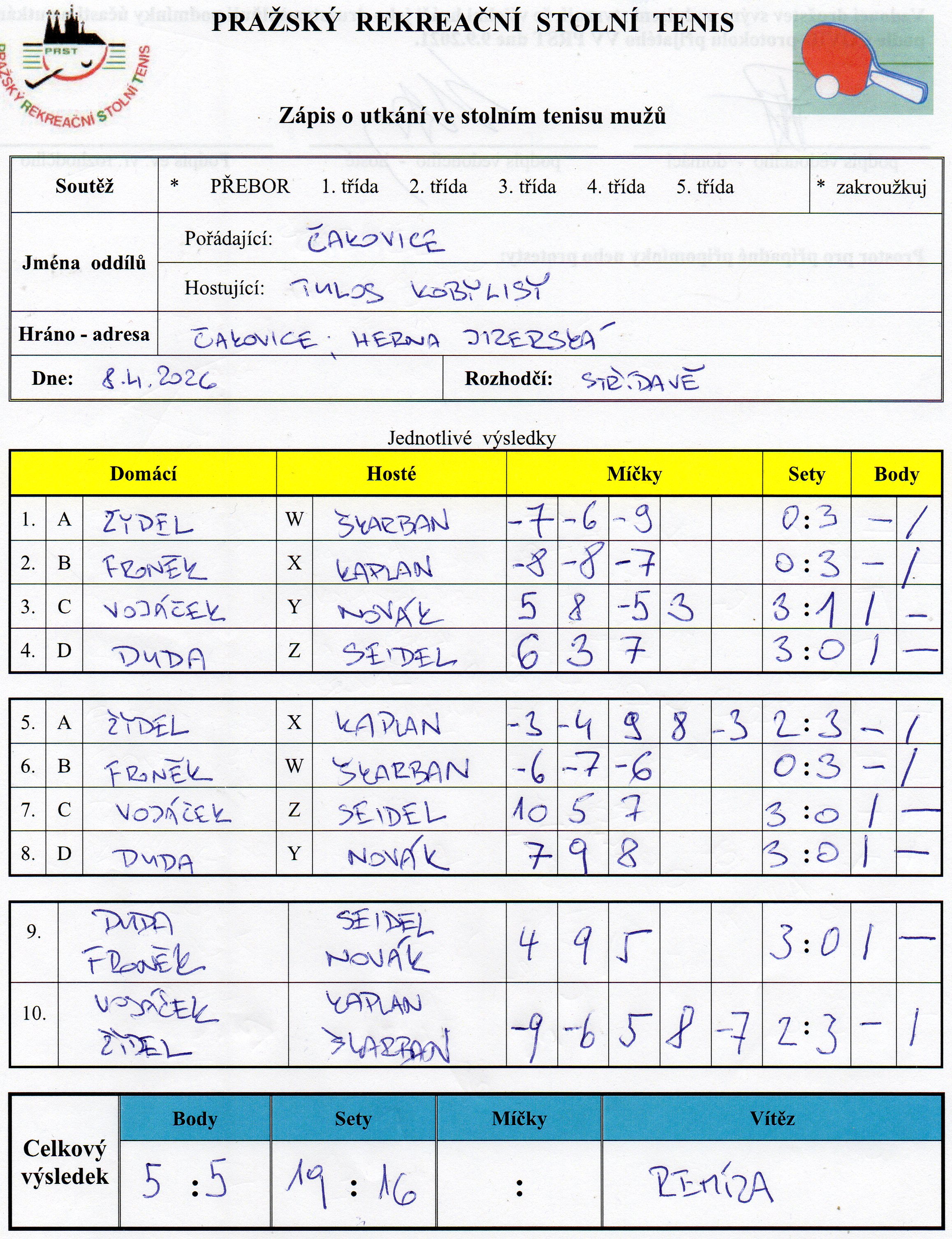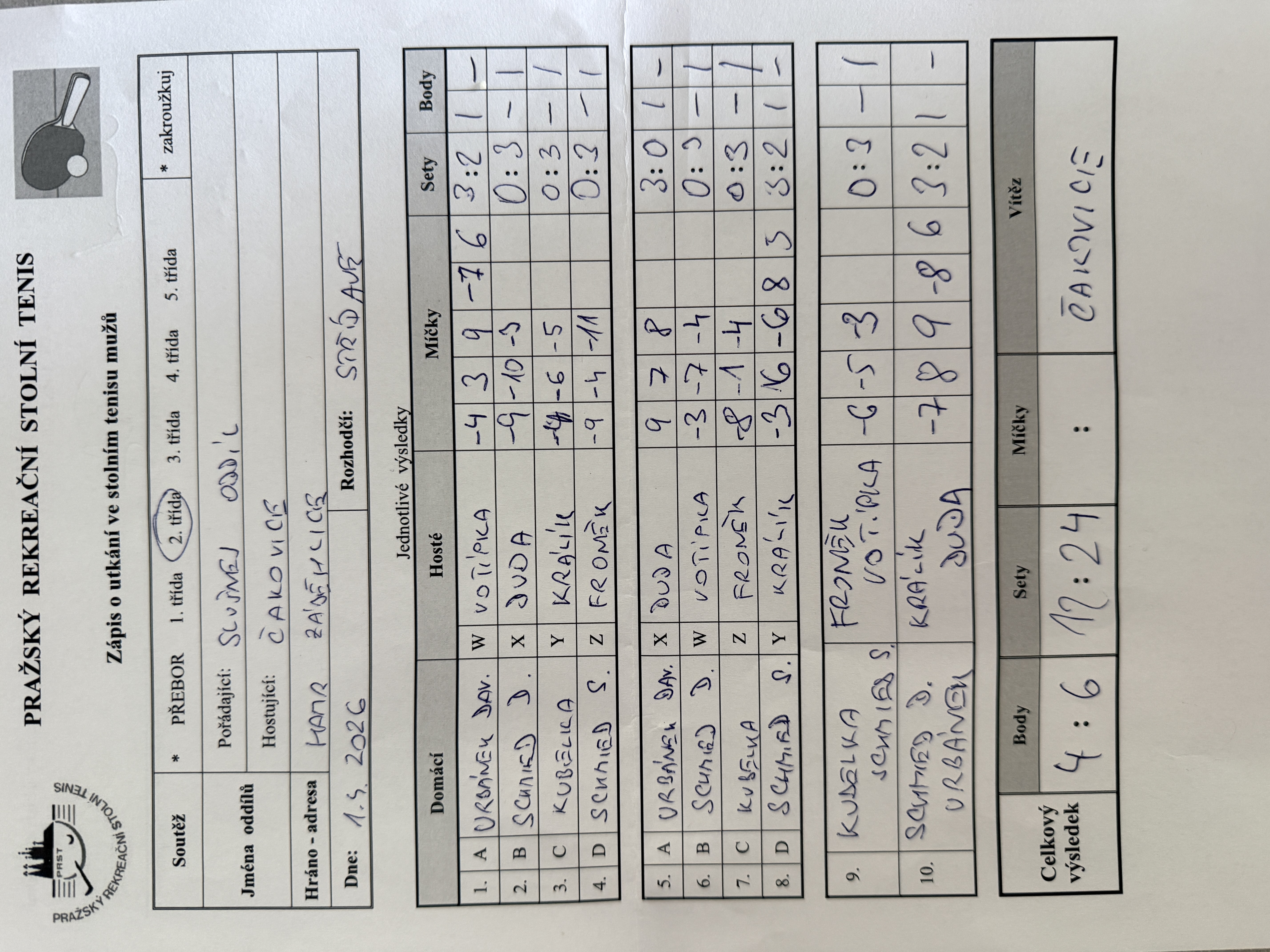 | 21/2 | Slušnej oddíl | Čakovice | 4 : 6 | st 01.04.2026 20:00 | | | 01.04.2026 22:57 |