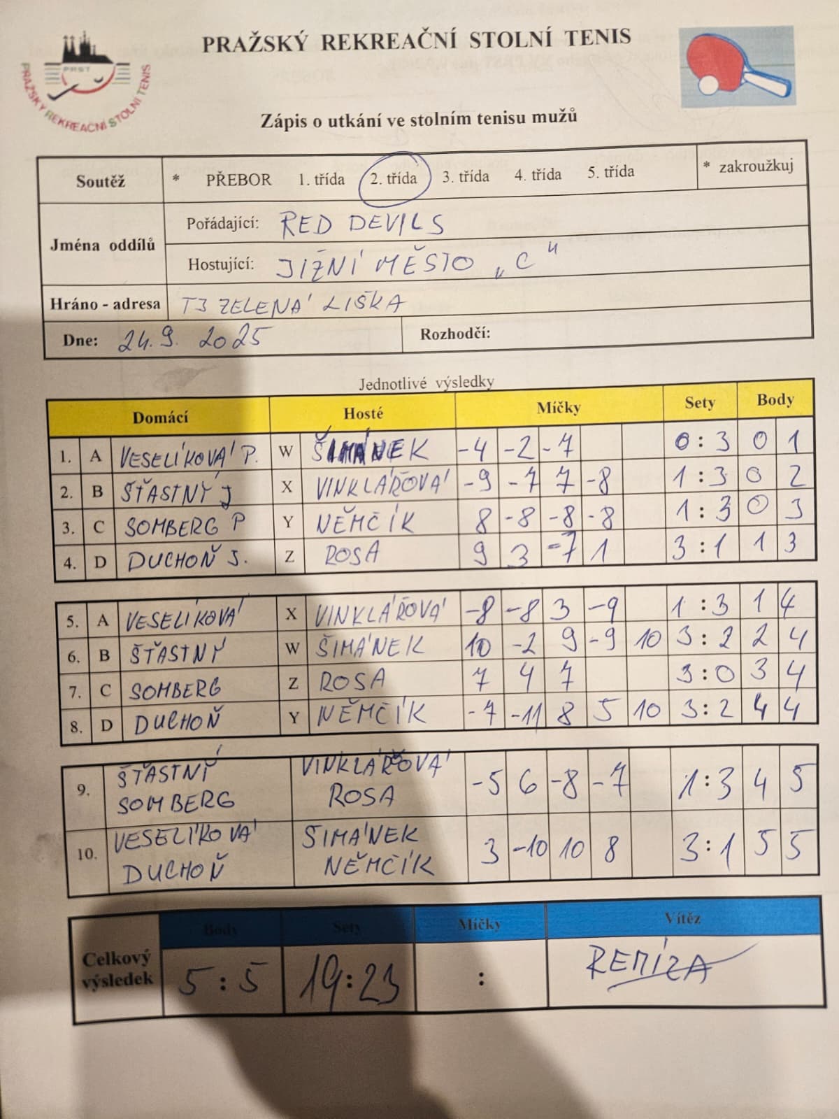 | 2/5 | Red Devils | Jižní Město C | 5 : 5 | st 24.09.2025 19:00 | | | 26.09.2025 15:00 mirosl |