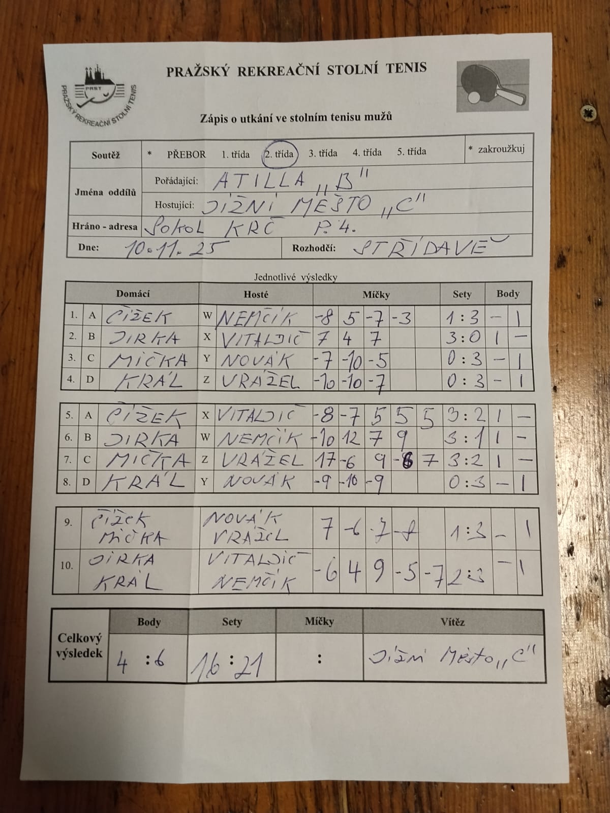| 8/5 | Attila B | Jižní Město C | 4 : 6 | po 10.11.2025 19:30 | | | 10.11.2025 20:58 c.venc |