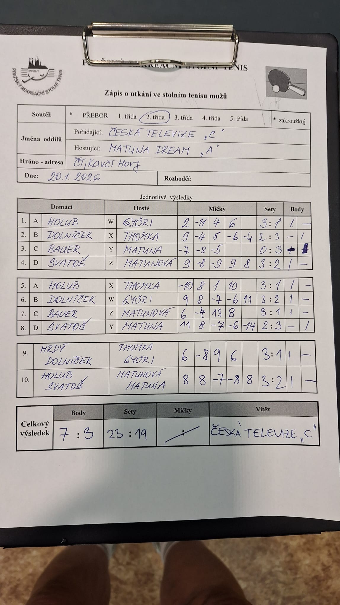 | 12/2 | Tulos Kobylisy | Matuna Dream A | 3 : 7 | st 07.01.2026 18:00 | | | 08.01.2026 08:02 seidel |