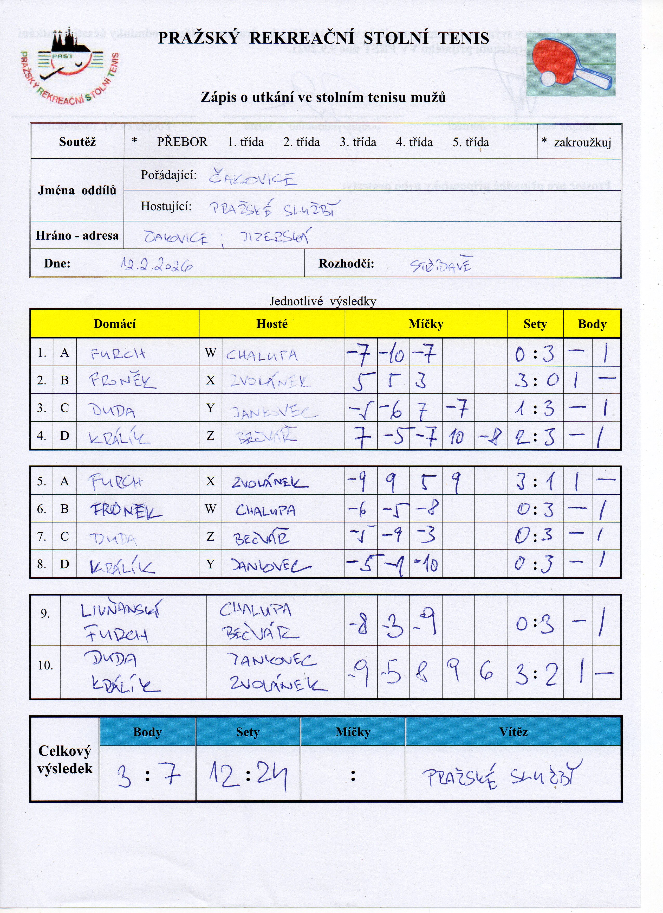 | 16/1 | Čakovice | Pražské služby A | 3 : 7 | čt 12.02.2026 19:00 | | | 12.02.2026 21:34 livnan |