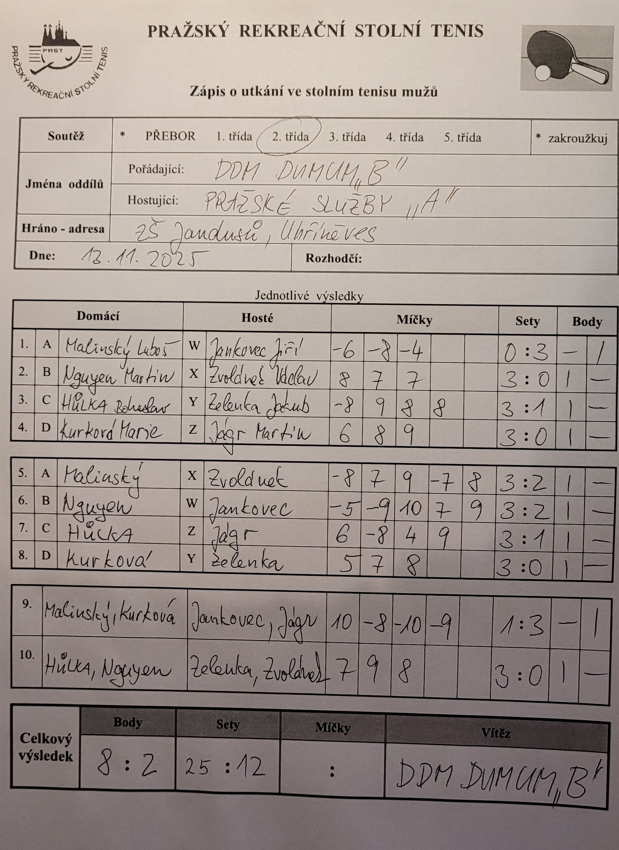 | 8/6 | DDM Praha 10 B | Pražské služby A | 8 : 2 | čt 13.11.2025 20:00 | | | 13.11.2025 23:35 bhulka |