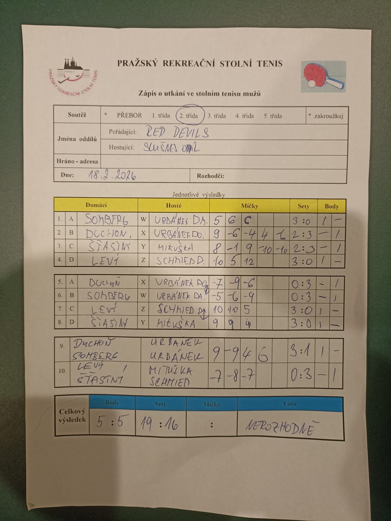 | 17/3 | Red Devils | Slušnej oddíl | 5 : 5 | st 18.02.2026 19:00 | | | 19.02.2026 09:37 mirosl |