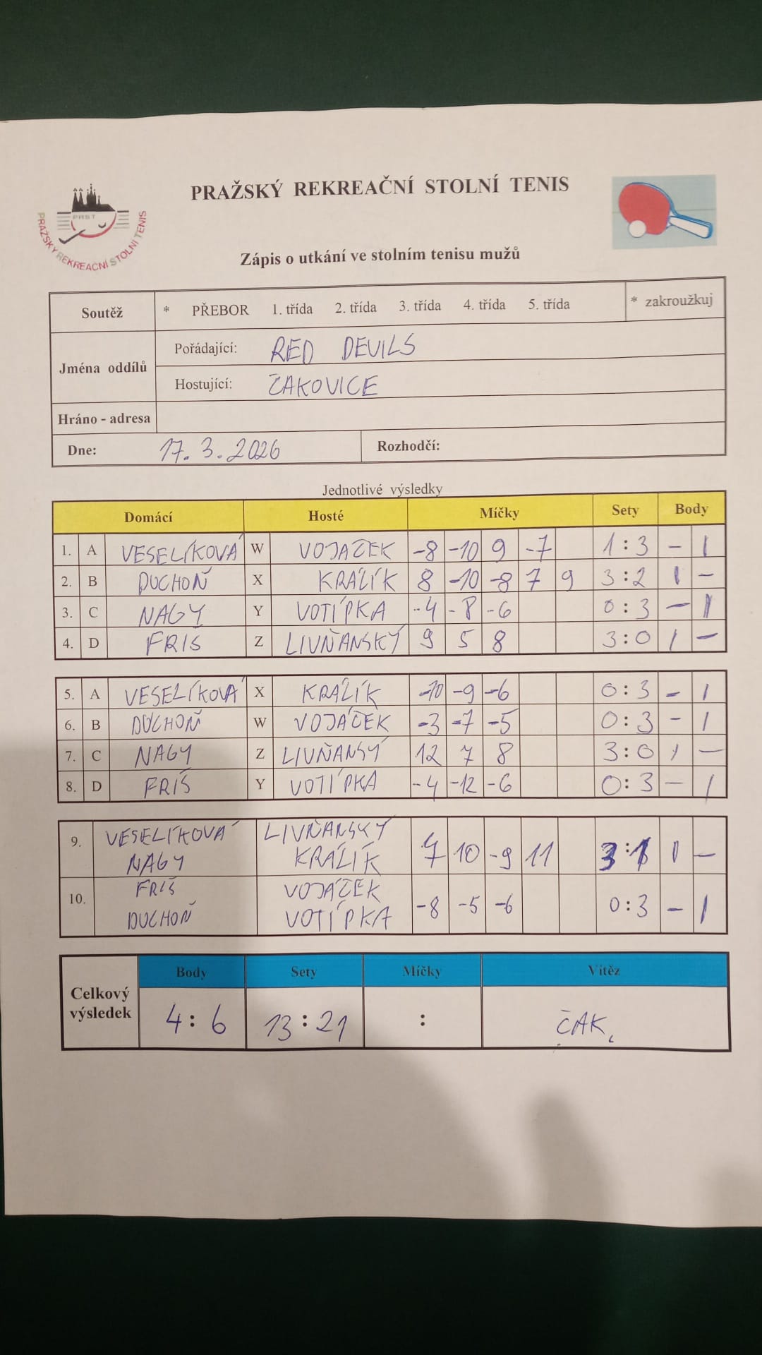| 19/3 | Red Devils | Čakovice | 4 : 6 | út 17.03.2026 19:00 | | | 18.03.2026 20:01 mirosl |