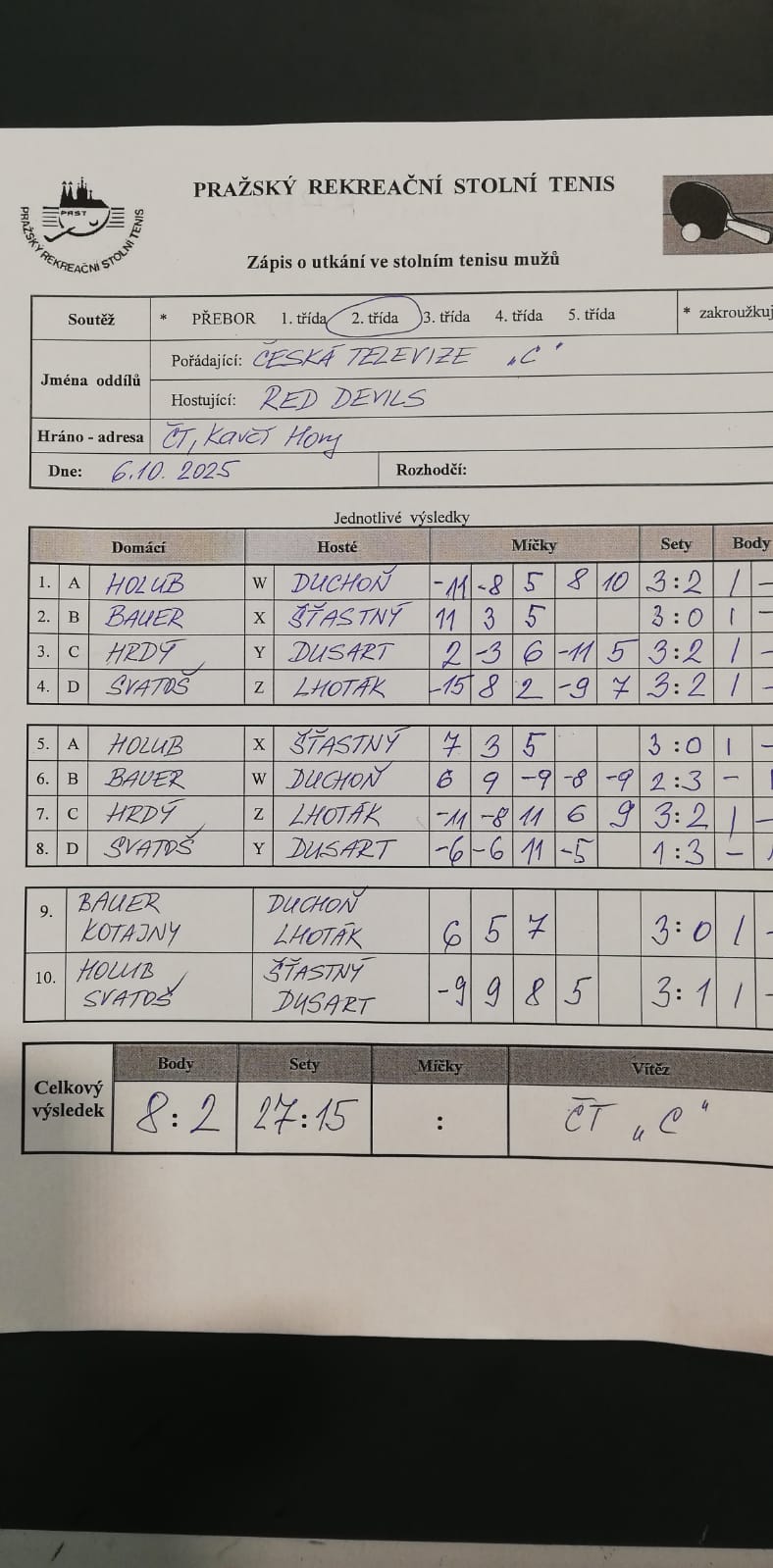| 4/1 | Česká televize C | Red Devils | 8 : 2 | po 06.10.2025 18:00 | | | 07.10.2025 00:01 radek. |