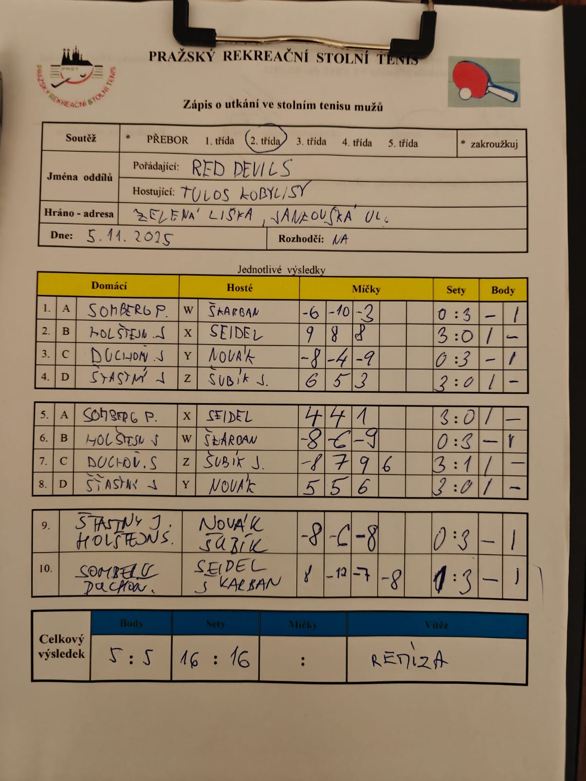 | 7/5 | Red Devils | Tulos Kobylisy | 5 : 5 | st 05.11.2025 19:00 | | | 05.11.2025 22:19 seidel |