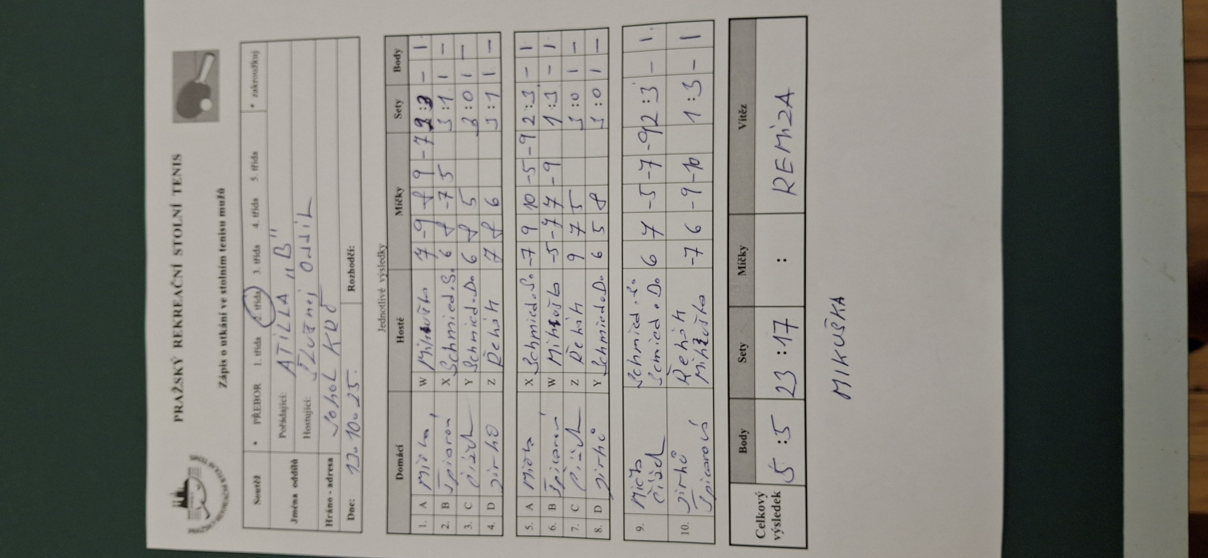 | 1/3 | Attila B | Slušnej oddíl | 5 : 5 | po 13.10.2025 18:00 | | | 14.10.2025 12:14 radek. |