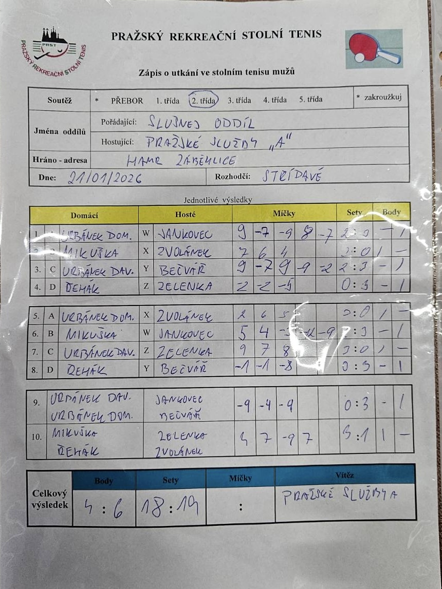 | 14/4 | Slušnej oddíl | Pražské služby A | 4 : 6 | st 21.01.2026 20:00 | | | 22.01.2026 20:35 s.schm |
