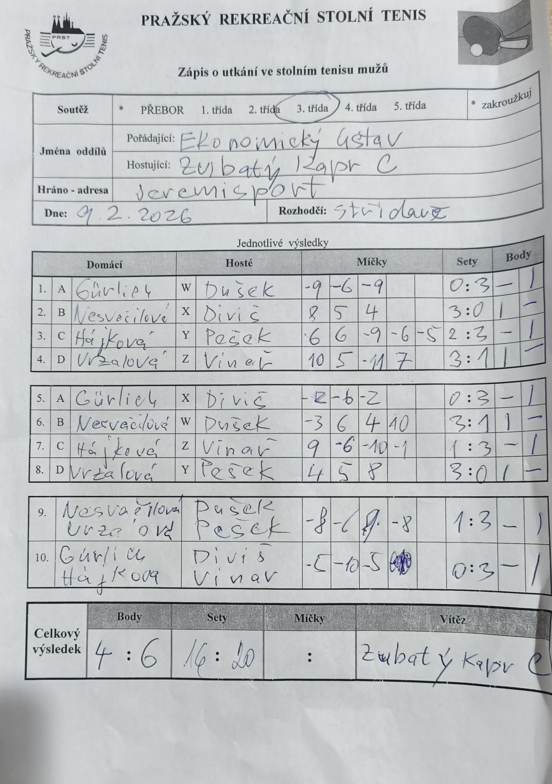 | 16/3 | Ekonomický ústav | Zubatý kapr C | 4 : 6 | po 09.02.2026 18:00 | | | 09.02.2026 20:14 klekip |