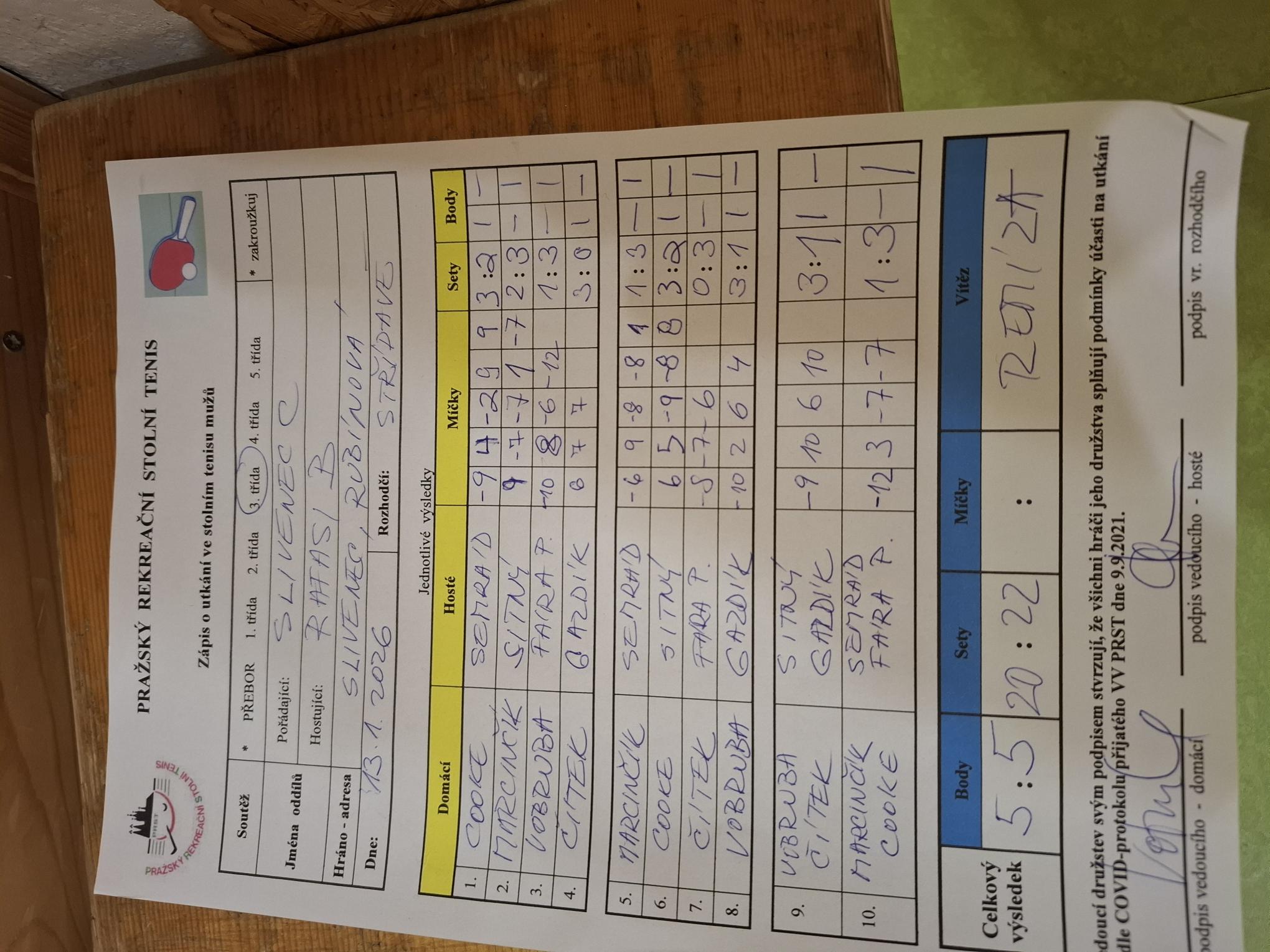 | 13/6 | Slivenec C | RAFASI B | 5 : 5 | út 13.01.2026 18:00 | | | 14.01.2026 13:25 v.jago |