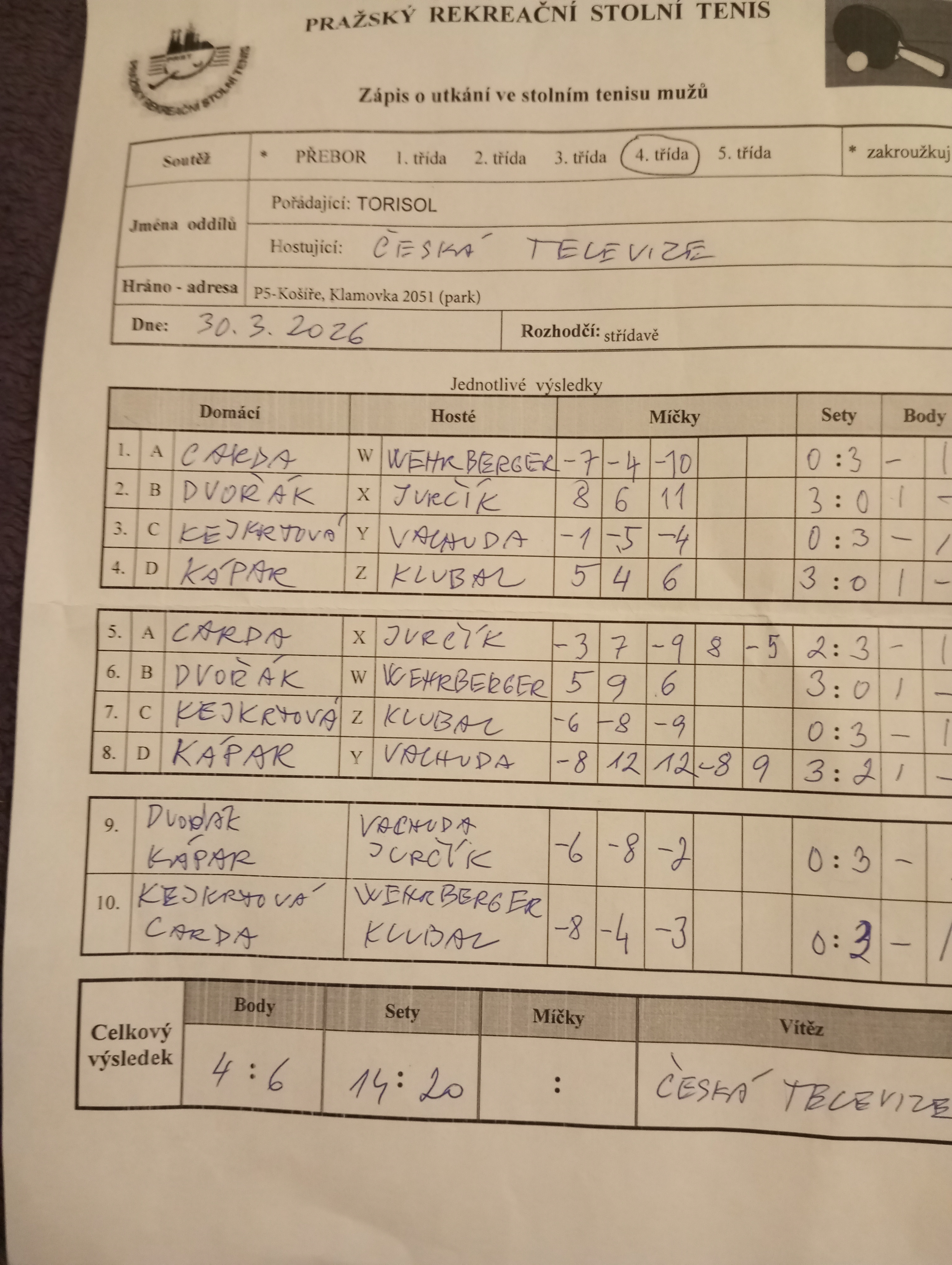 | 7 | Torisol | Česká televize D | 4 : 6 | po 30.03.2026 18:00 | | | 31.03.2026 19:30 kapar. |