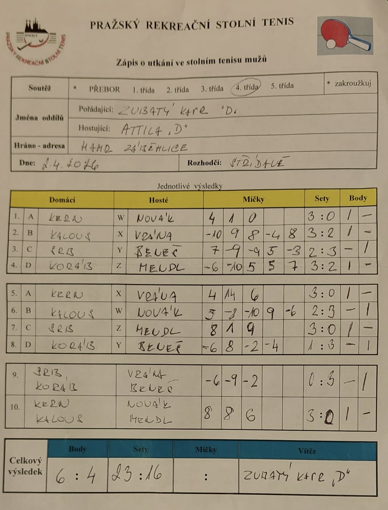 | 23/4 | Attila D | DDM Praha 10 C | 2 : 8 | st 22.04.2026 18:00 | | | 24.04.2026 13:24 novak. |