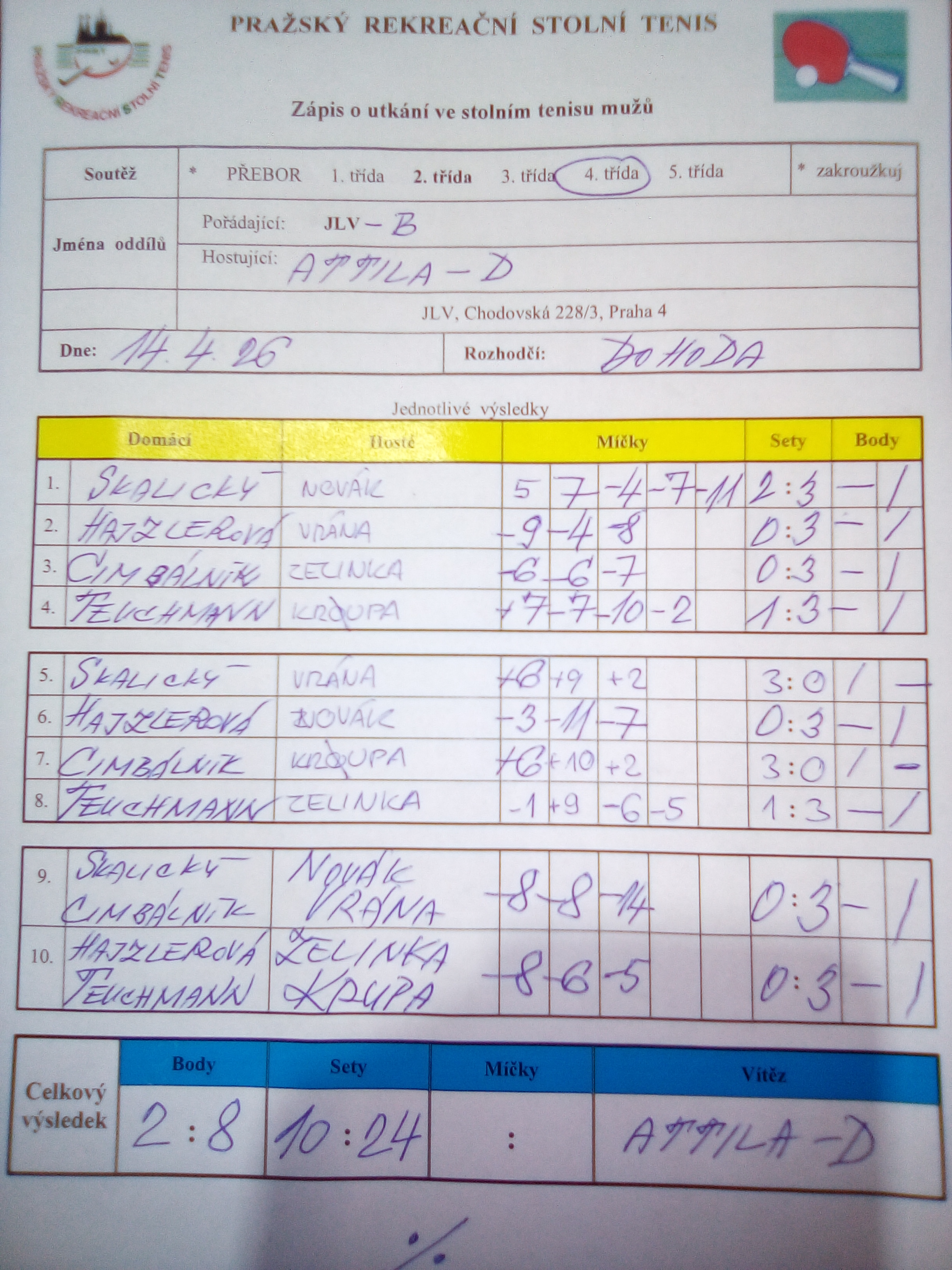 | 26/3 | JLV B | Attila D | 2 : 8 | út 14.04.2026 19:00 | | | 14.04.2026 21:23 ok1mpt |