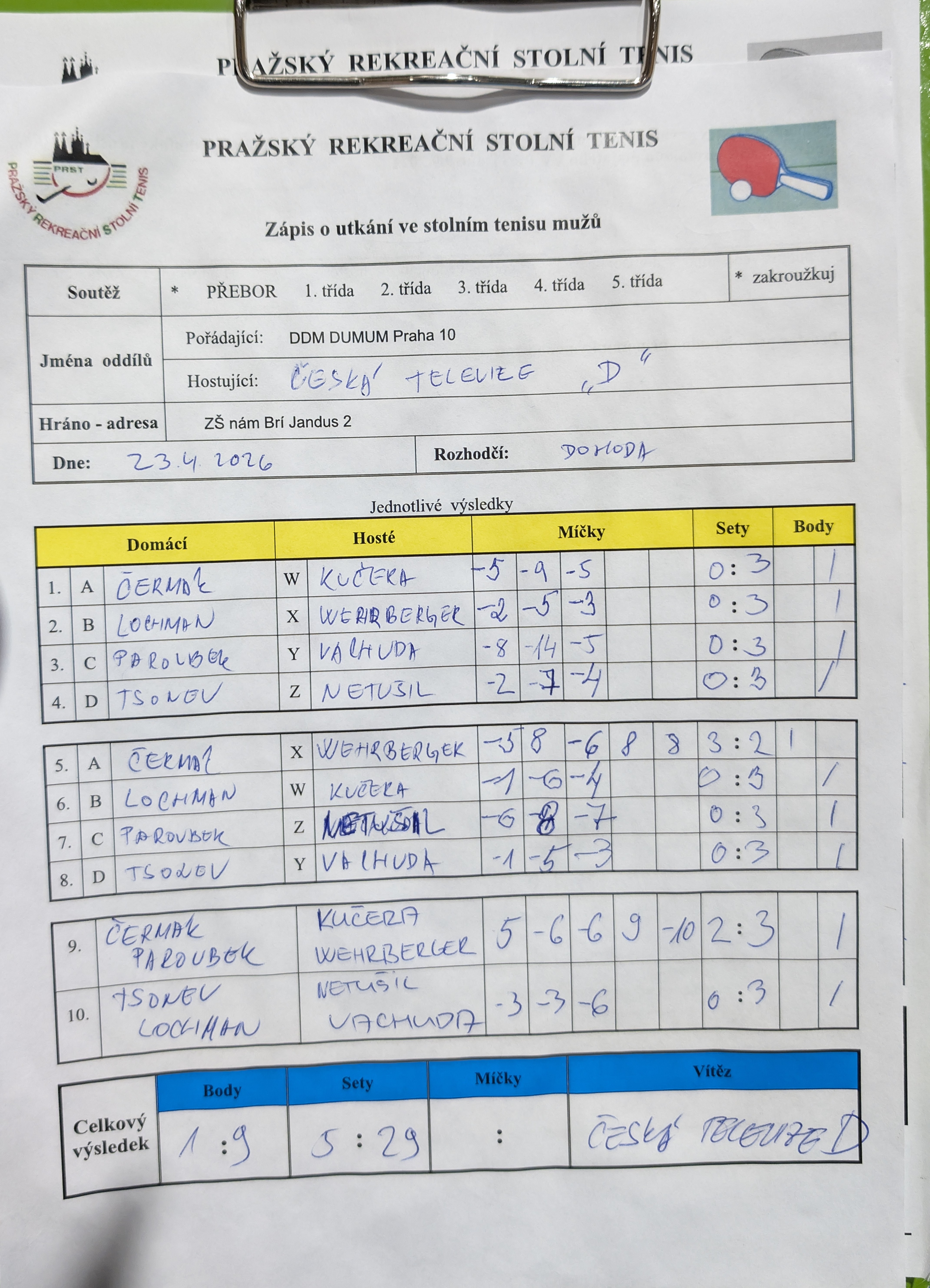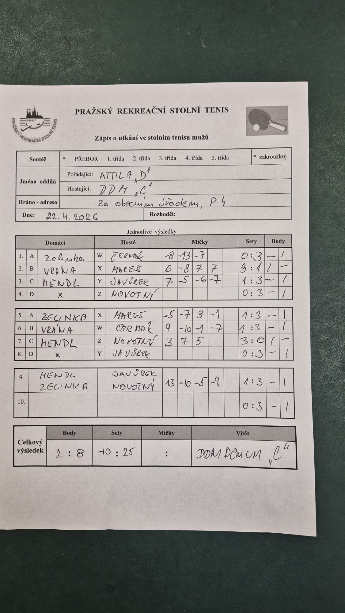 | 23/4 | Attila D | DDM Praha 10 C | 2 : 8 | st 22.04.2026 18:00 | | | 24.04.2026 13:24 novak. |