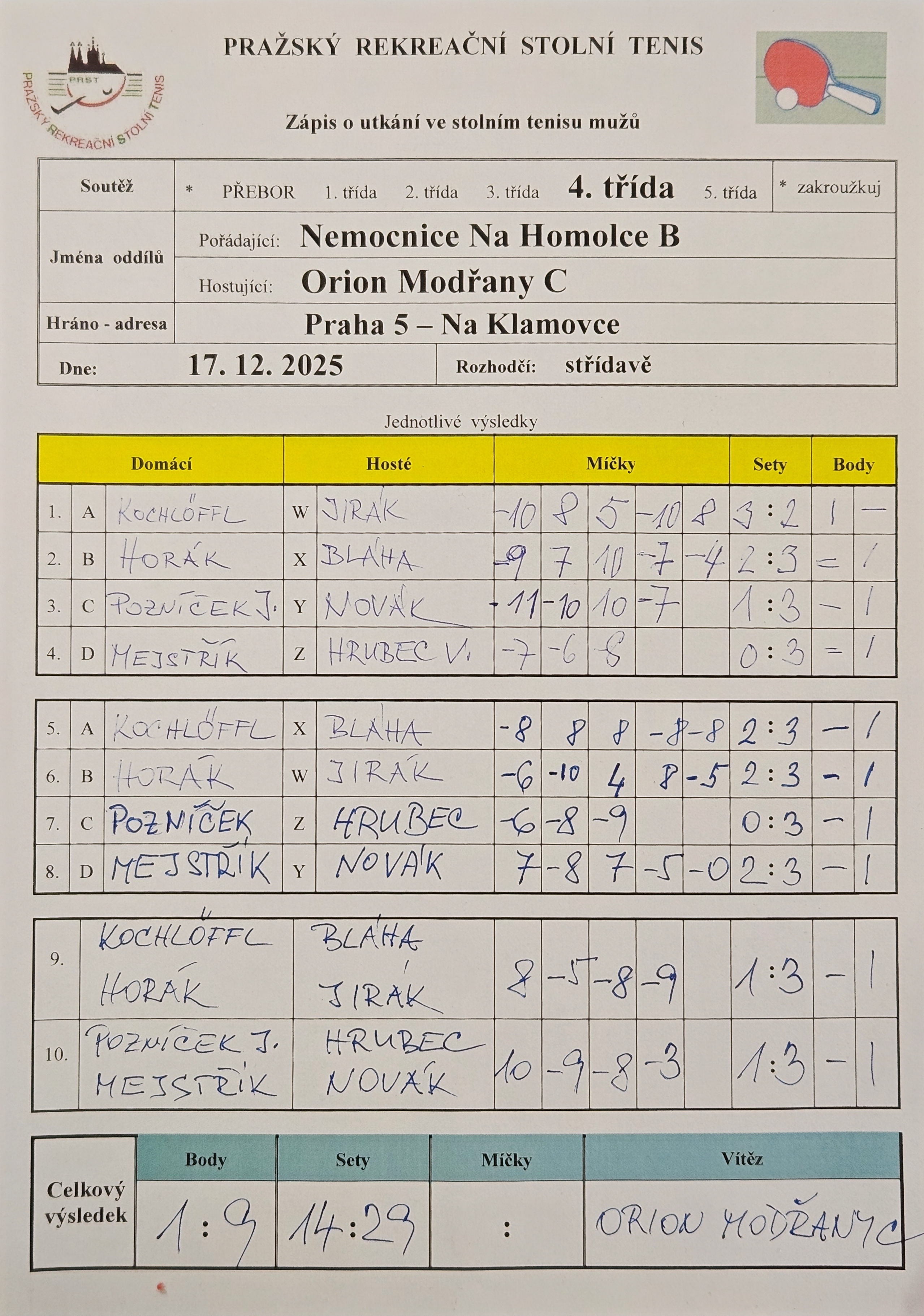 | 26/1 | Orion Modřany C | Nem. Na Homolce B | email: DOM HOS | 13.04. - 23.04.+DNT | hrací den: pondělí 19:10 | | .. : |