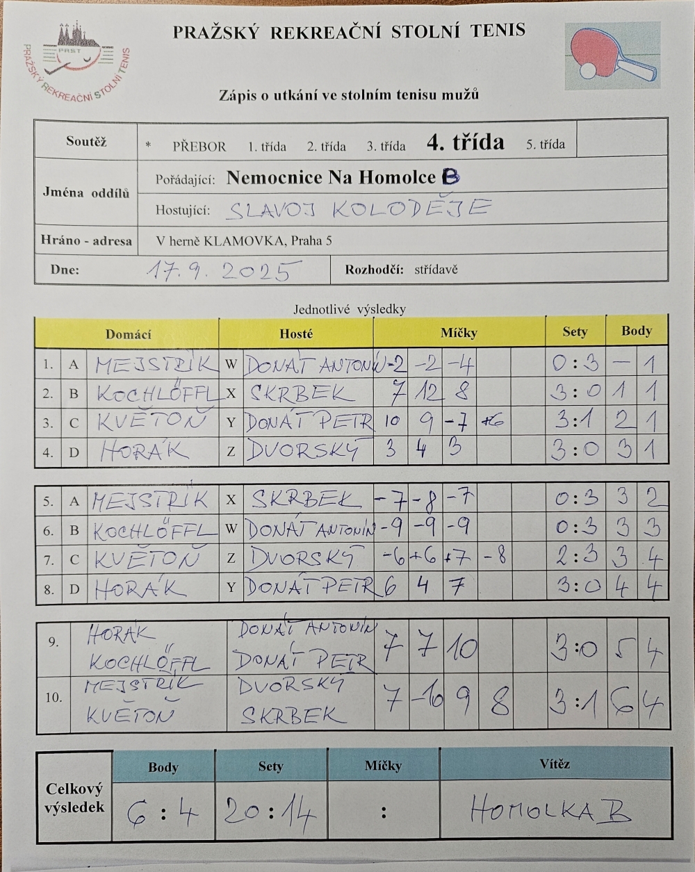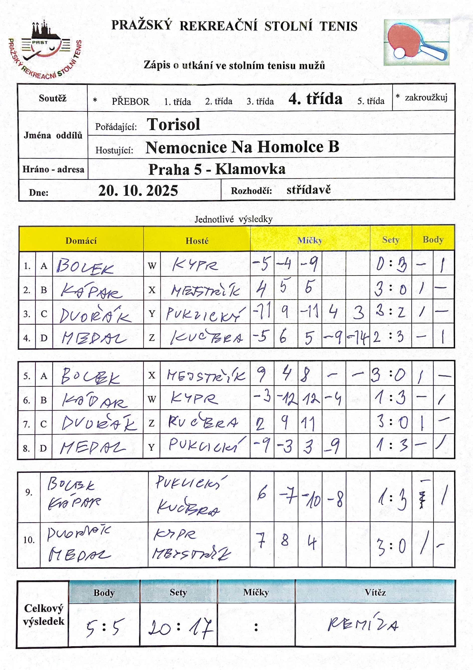 | 6/4 | Torisol | Nem. Na Homolce B | 5 : 5 | po 20.10.2025 18:00 | | | 22.10.2025 05:50 bolek |