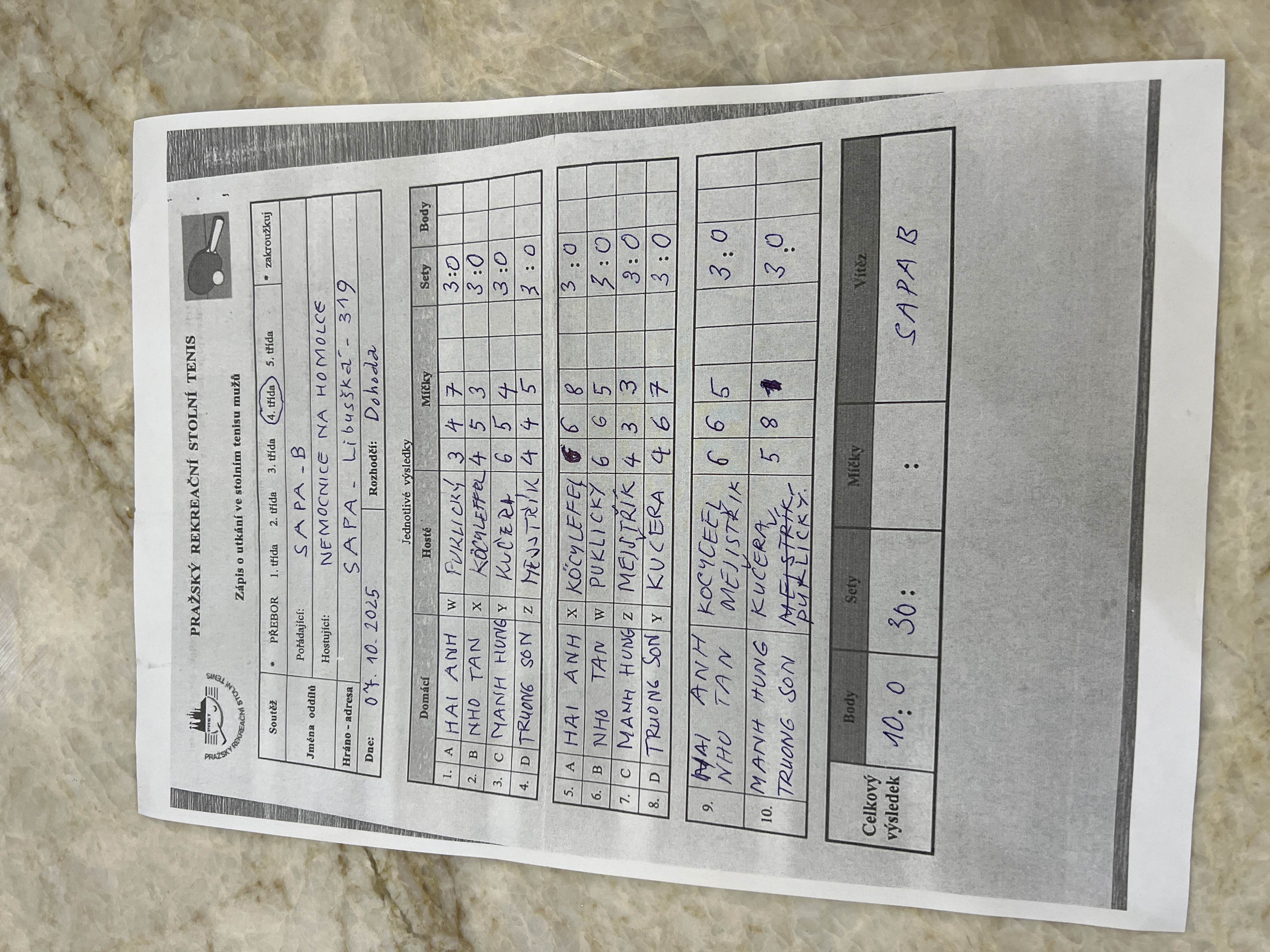 | 10/6 | SAPA A | Nem. Na Homolce B | 7 : 3 | čt 27.11.2025 18:00 | | | 27.11.2025 21:14 phan10 |