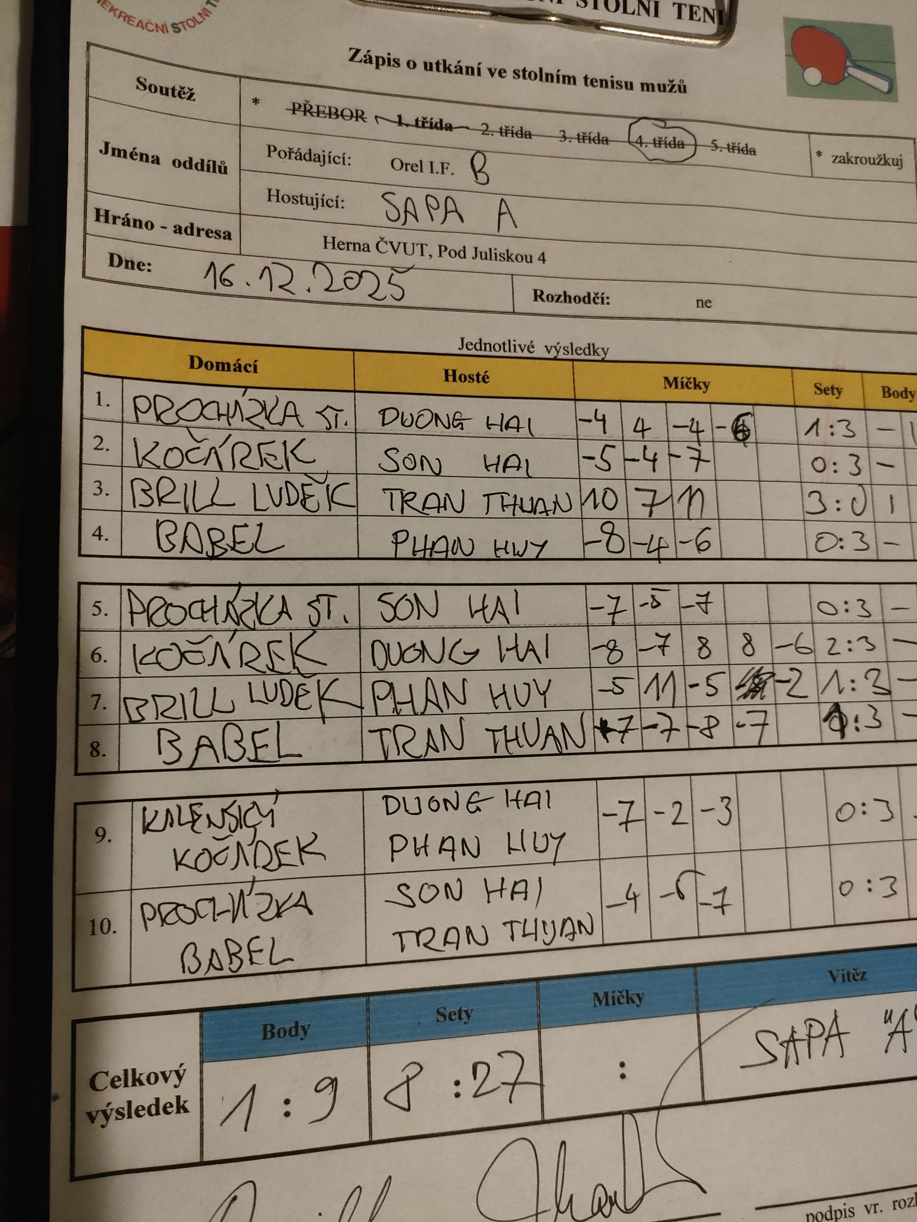 | 13/4 | Orel I.F. B | SAPA A | 1 : 9 | út 16.12.2025 19:15 | | | 17.12.2025 01:53 jarosl |