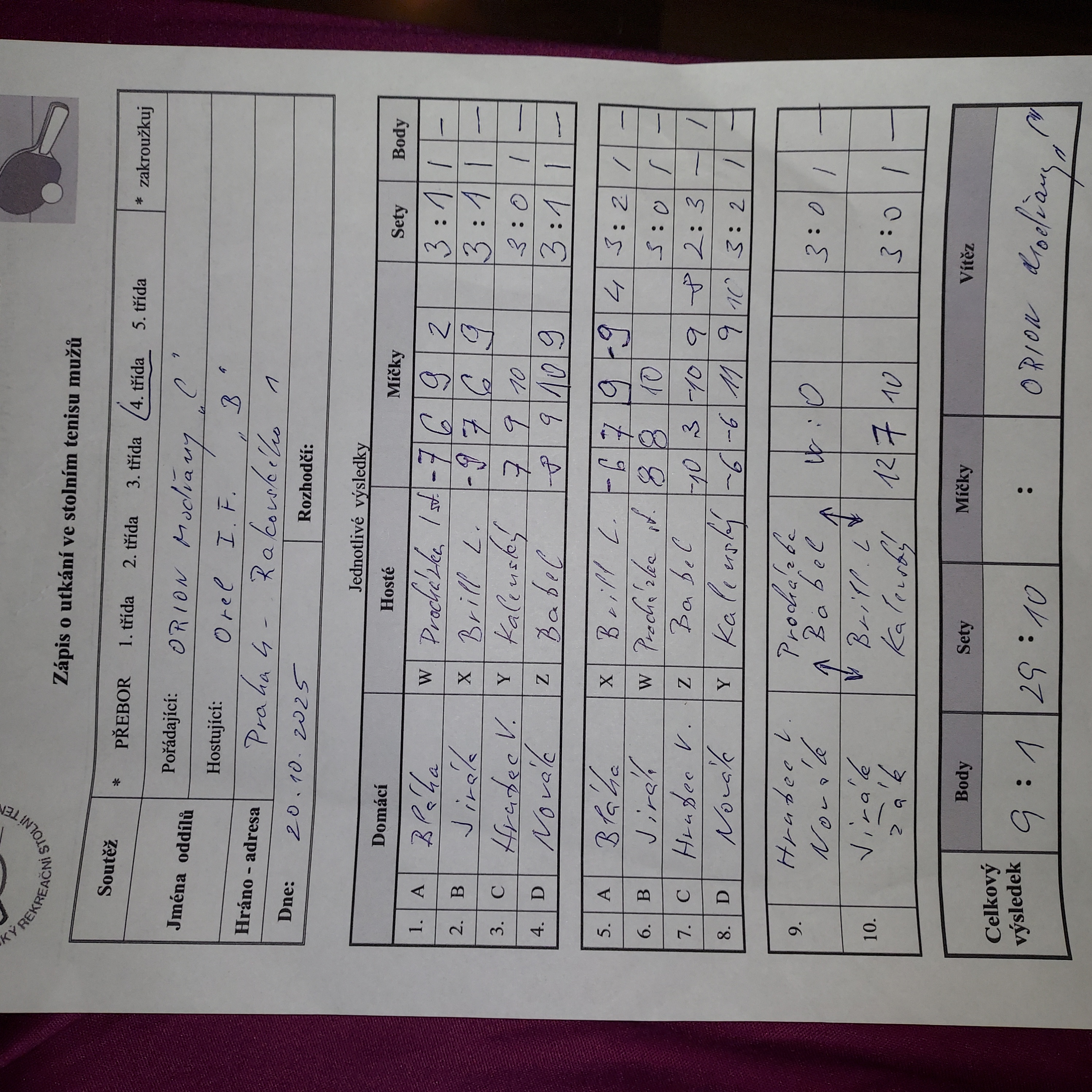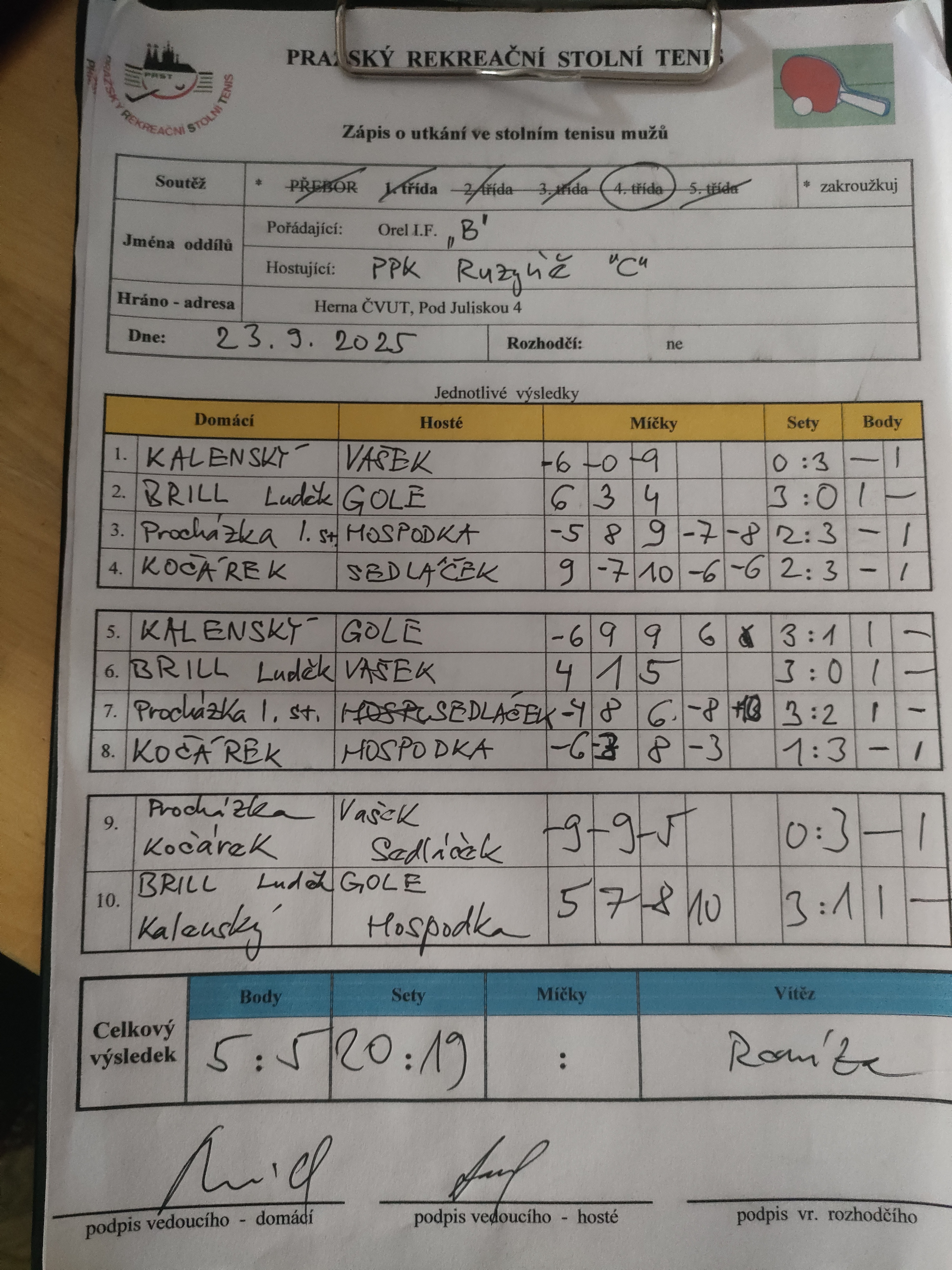 | 5/7 | Attila D | Orel I.F. B | 5 : 5 | po 03.11.2025 18:00 | | | 04.11.2025 12:45 jarosl |