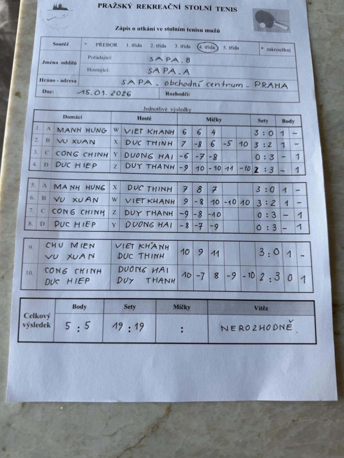 | 14/4 | SAPA B | SAPA A | 5 : 5 | čt 15.01.2026 15:00 | | | 18.01.2026 16:08 phan10 |