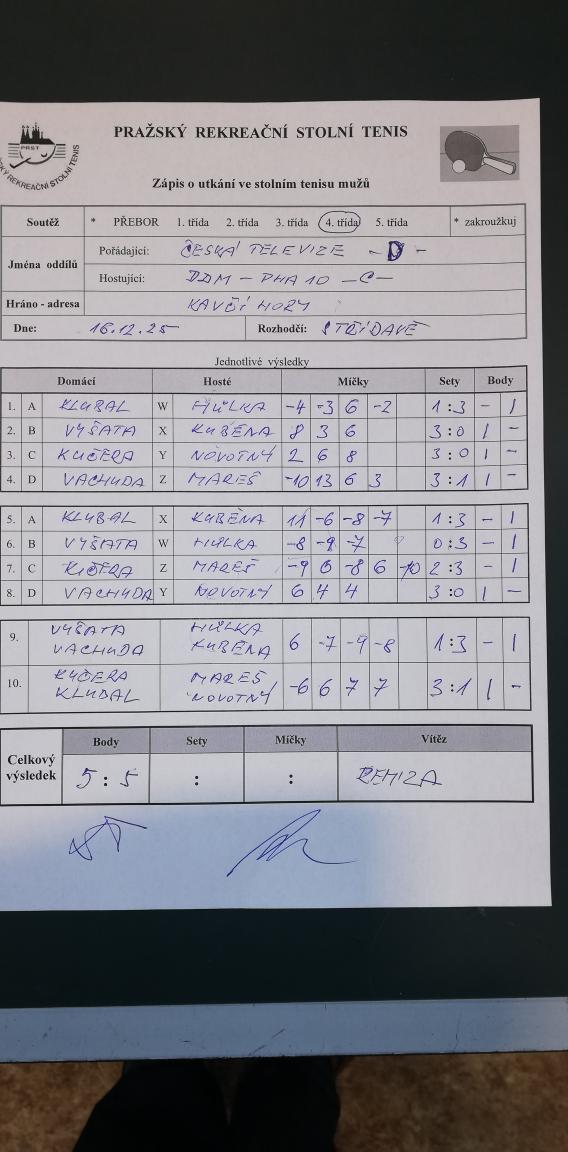 | 13/6 | Česká televize D | DDM Praha 10 C | 5 : 5 | út 16.12.2025 19:00 | | | 18.12.2025 12:12 radek. |