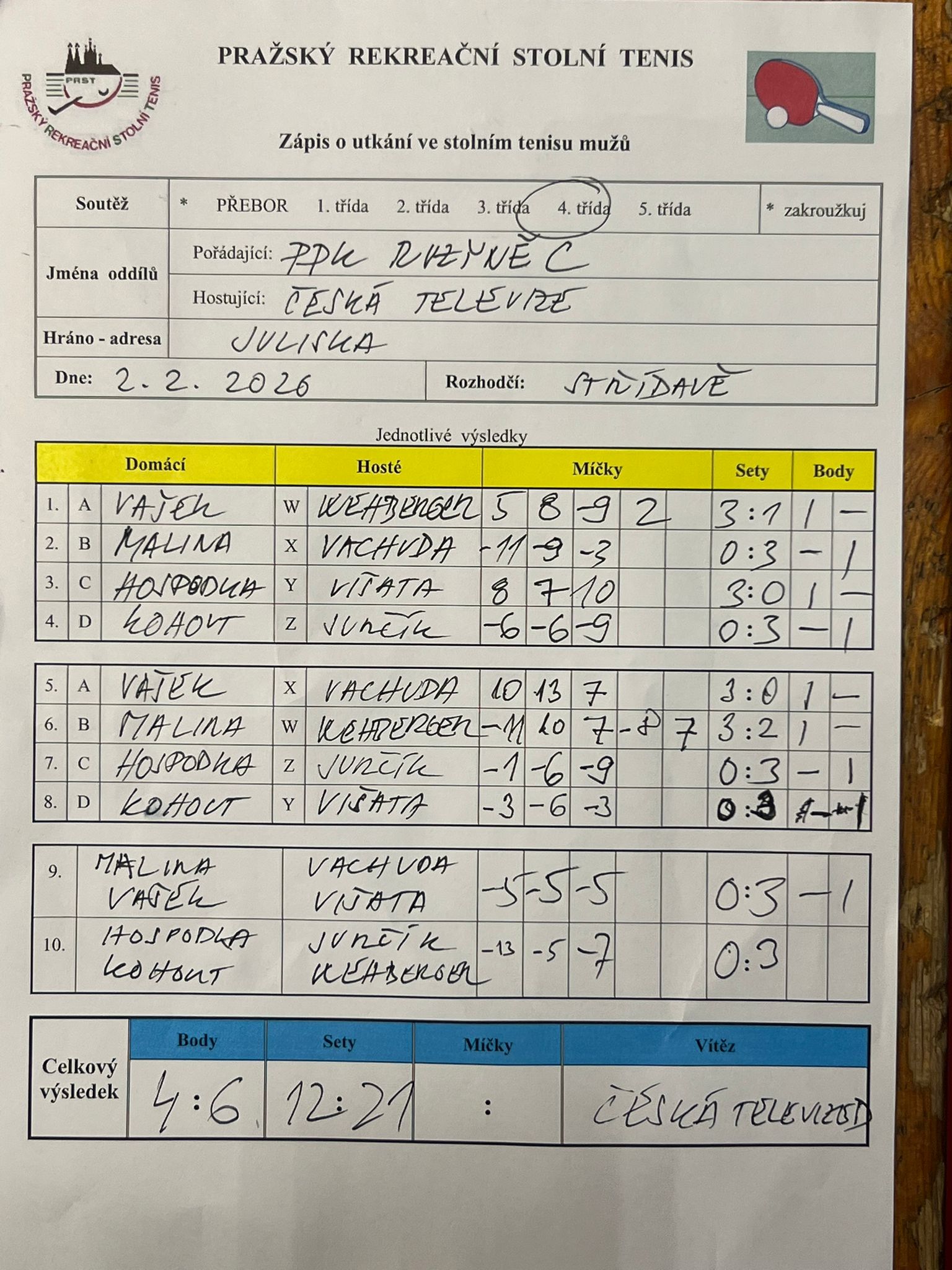 | 17/4 | PPK Ruzyně C | Česká televize D | 4 : 6 | po 02.02.2026 19:20 | | | 06.02.2026 11:27 mar.se |