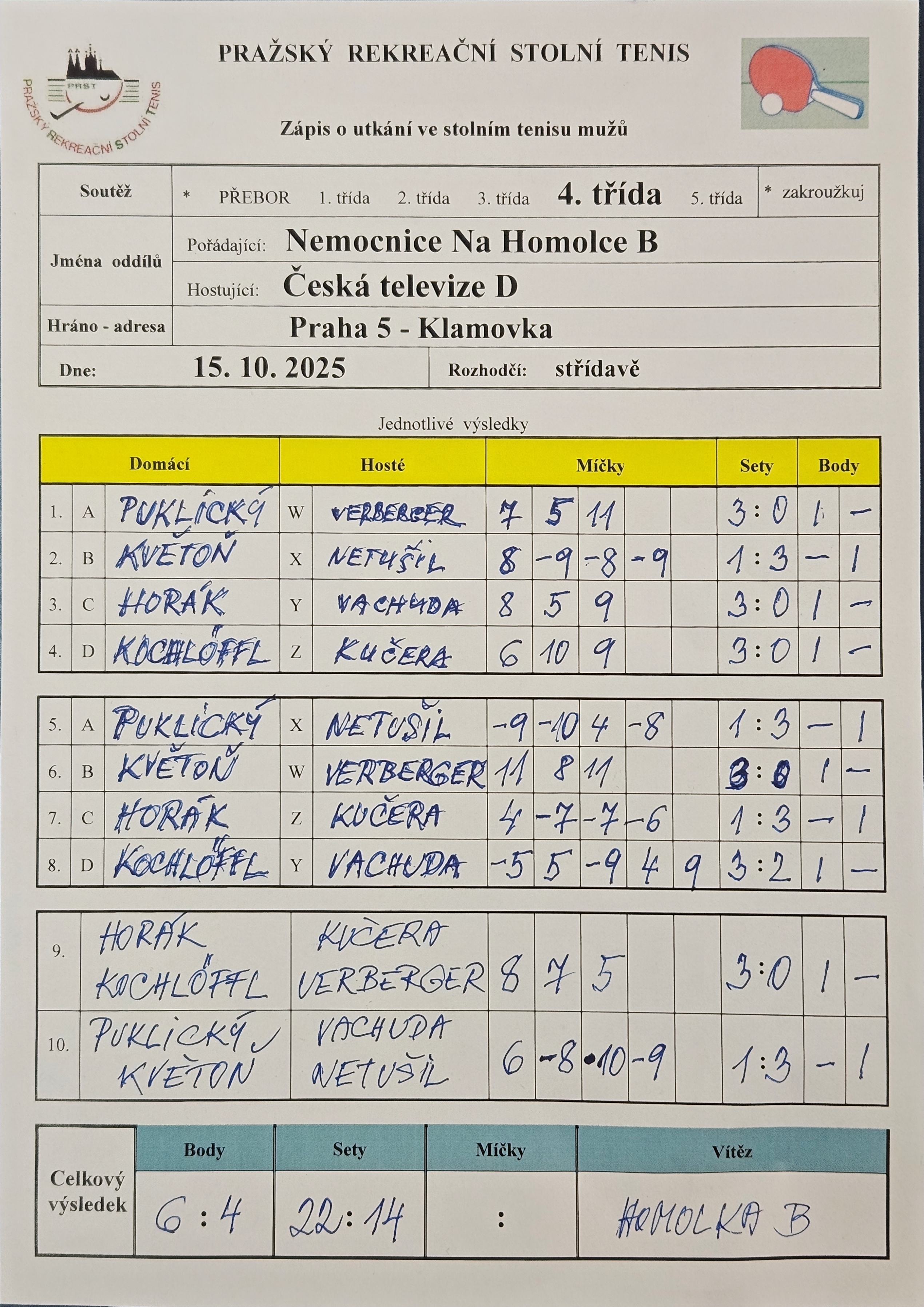 5/5 | Nem. Na Homolce B | Česká televize D | 6 : 4 | st 15.10.2025 18:00 | | | 15.10.2025 20:13 ehorak |