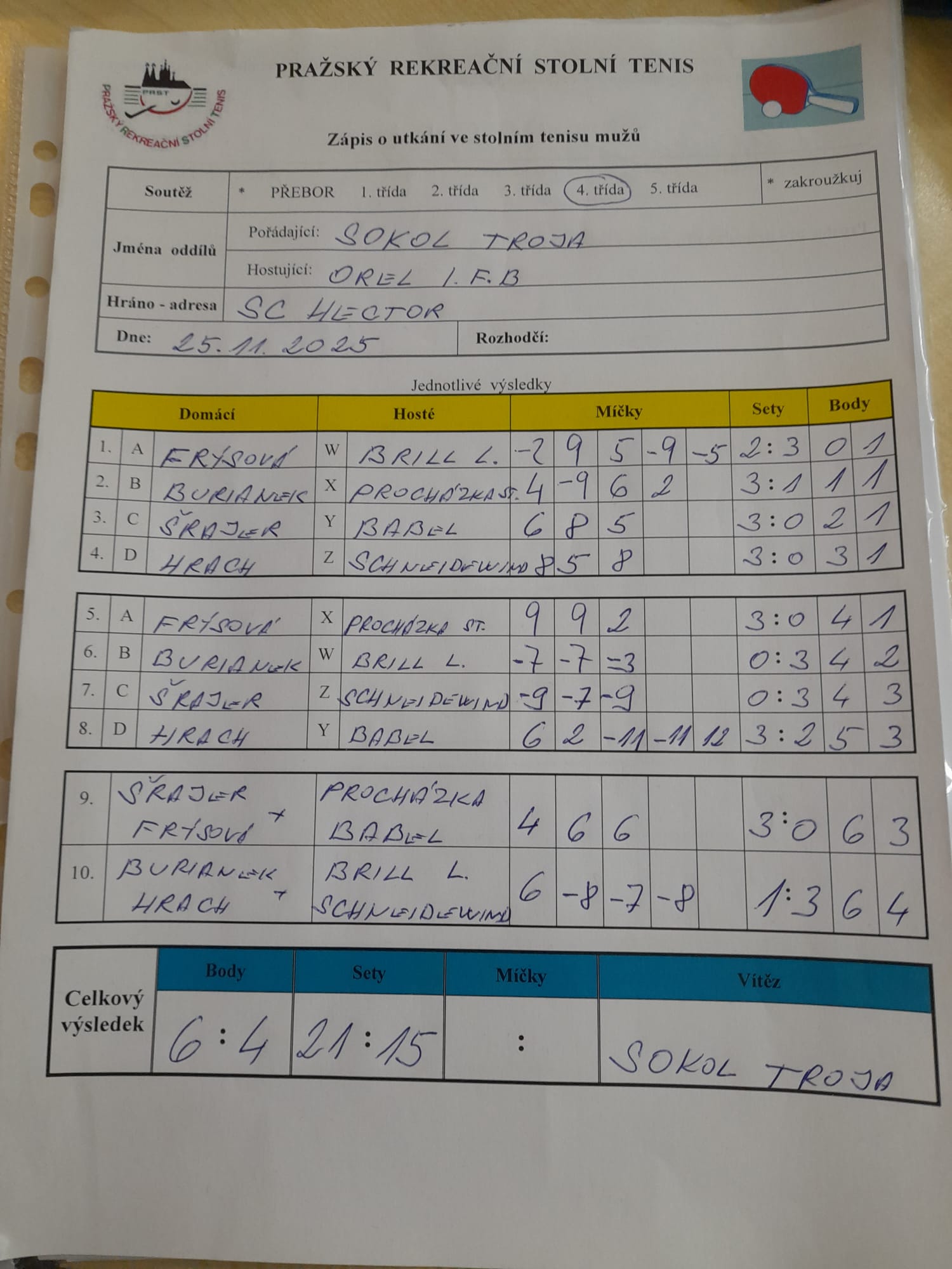 | 10/3 | Sokol Troja | Orel I.F. B | 6 : 4 | út 25.11.2025 19:00 | | | 25.11.2025 21:44 havlil |