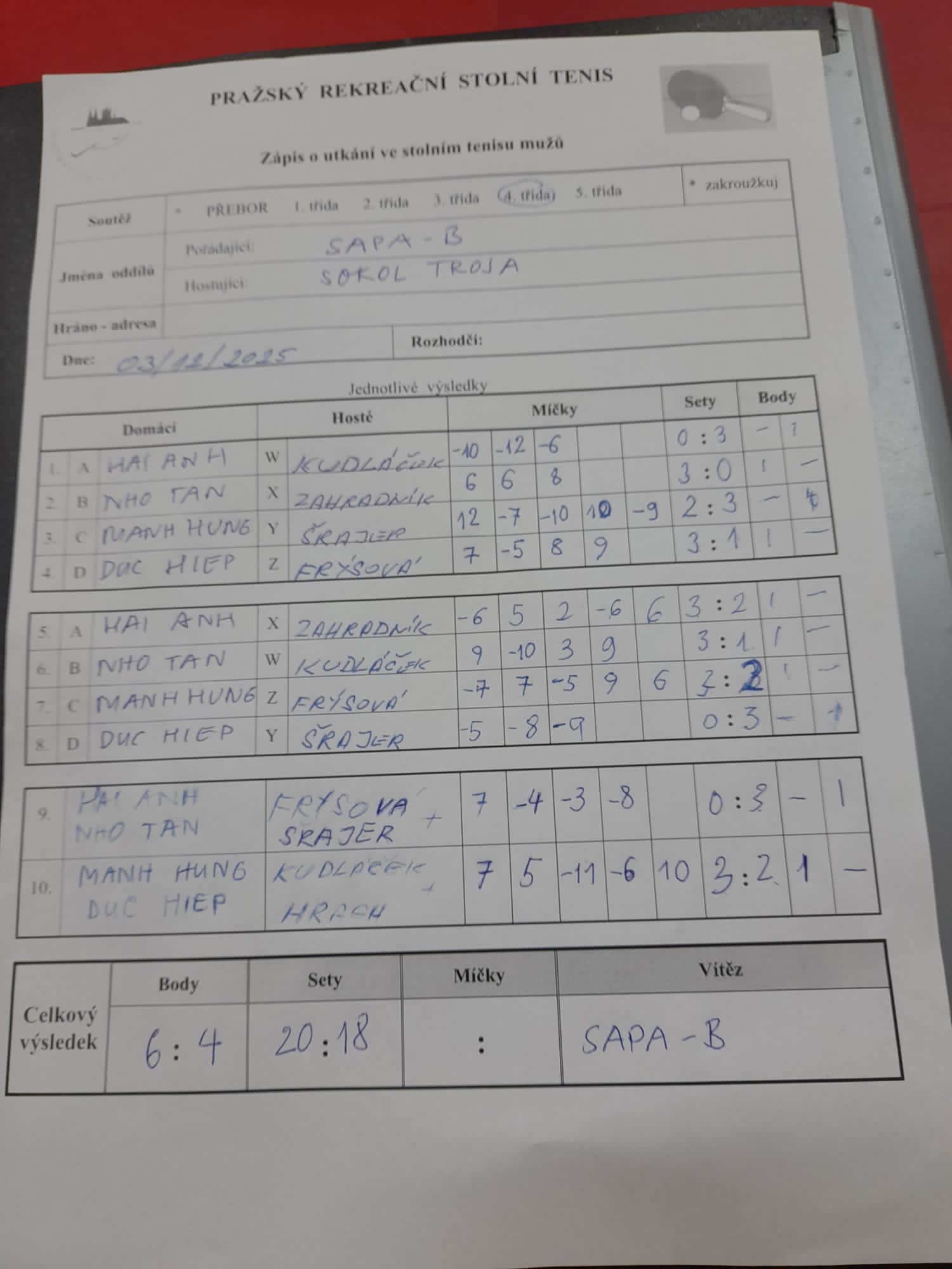 | 11/6 | SAPA B | Sokol Troja | 6 : 4 | st 03.12.2025 18:00 | | | 03.12.2025 21:58 chumie |