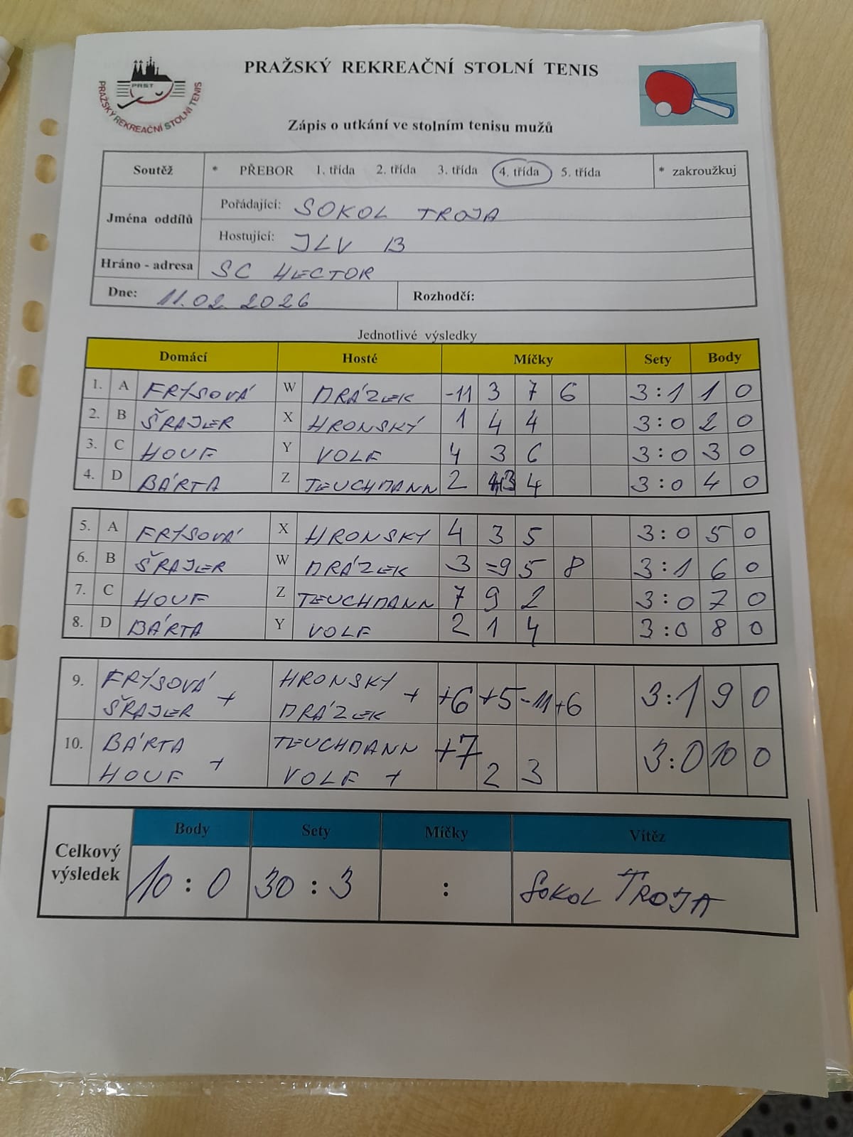 | 22/5 | Sokol Troja | Attila D | 9 : 1 | út 17.03.2026 20:00 | | | 18.03.2026 07:40 havlil |