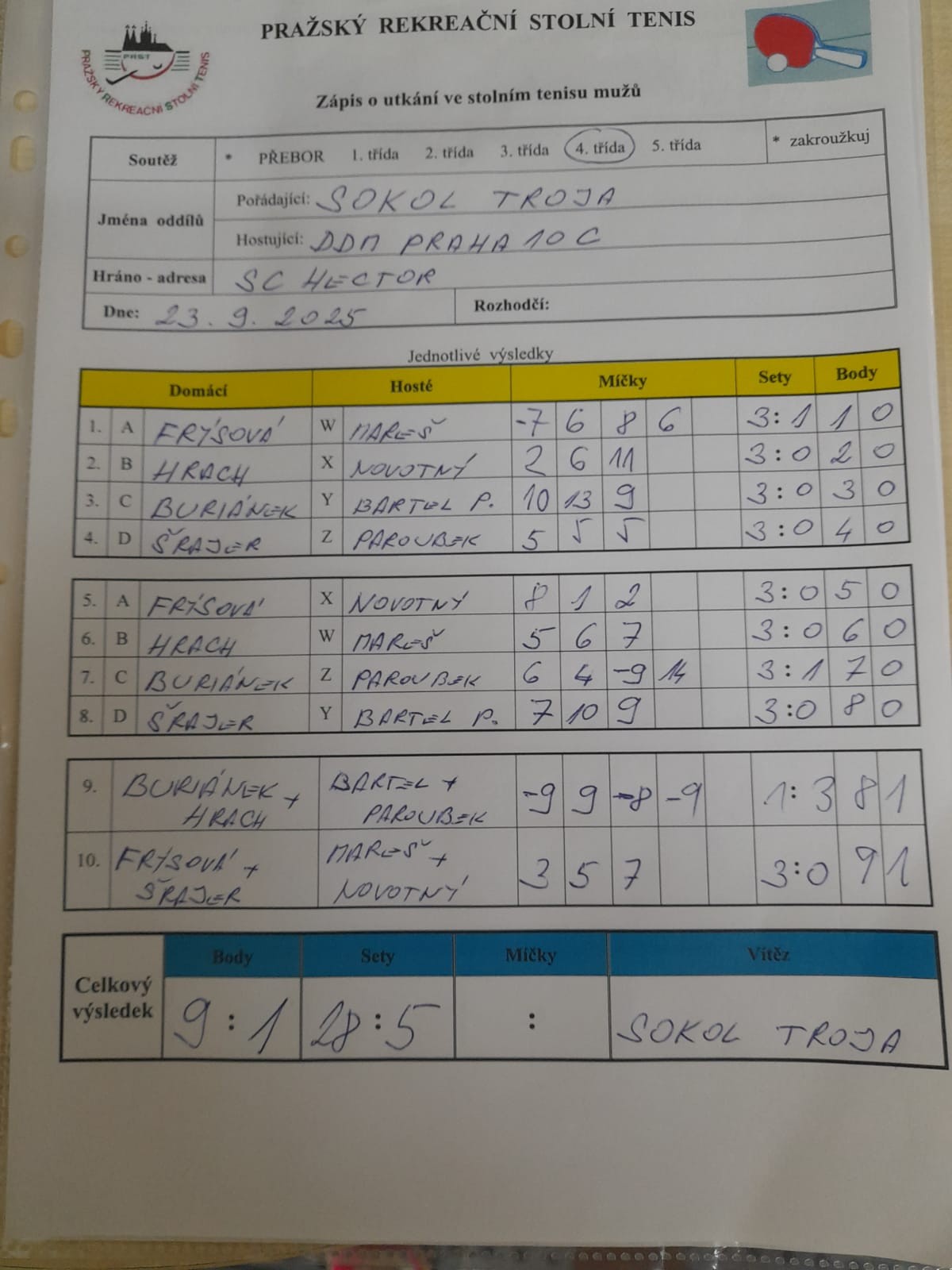 | 9/5 | Attila D | Sokol Troja | 1 : 9 | út 18.11.2025 19:00 | výměna pořadatelství = herna Troja | | 19.11.2025 13:03 radek. |