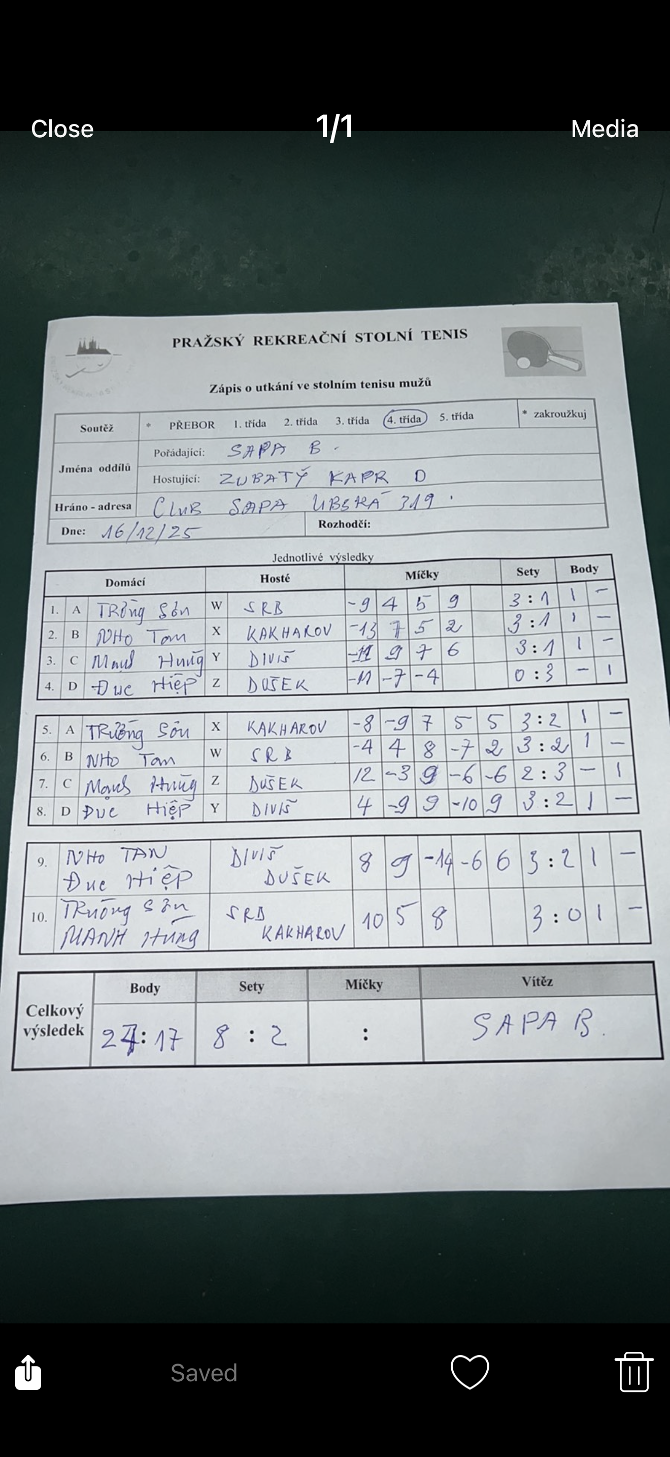 | 13/5 | SAPA B | Zubatý kapr D | 8 : 2 | út 16.12.2025 18:00 | | | 02.01.2026 07:57 |
