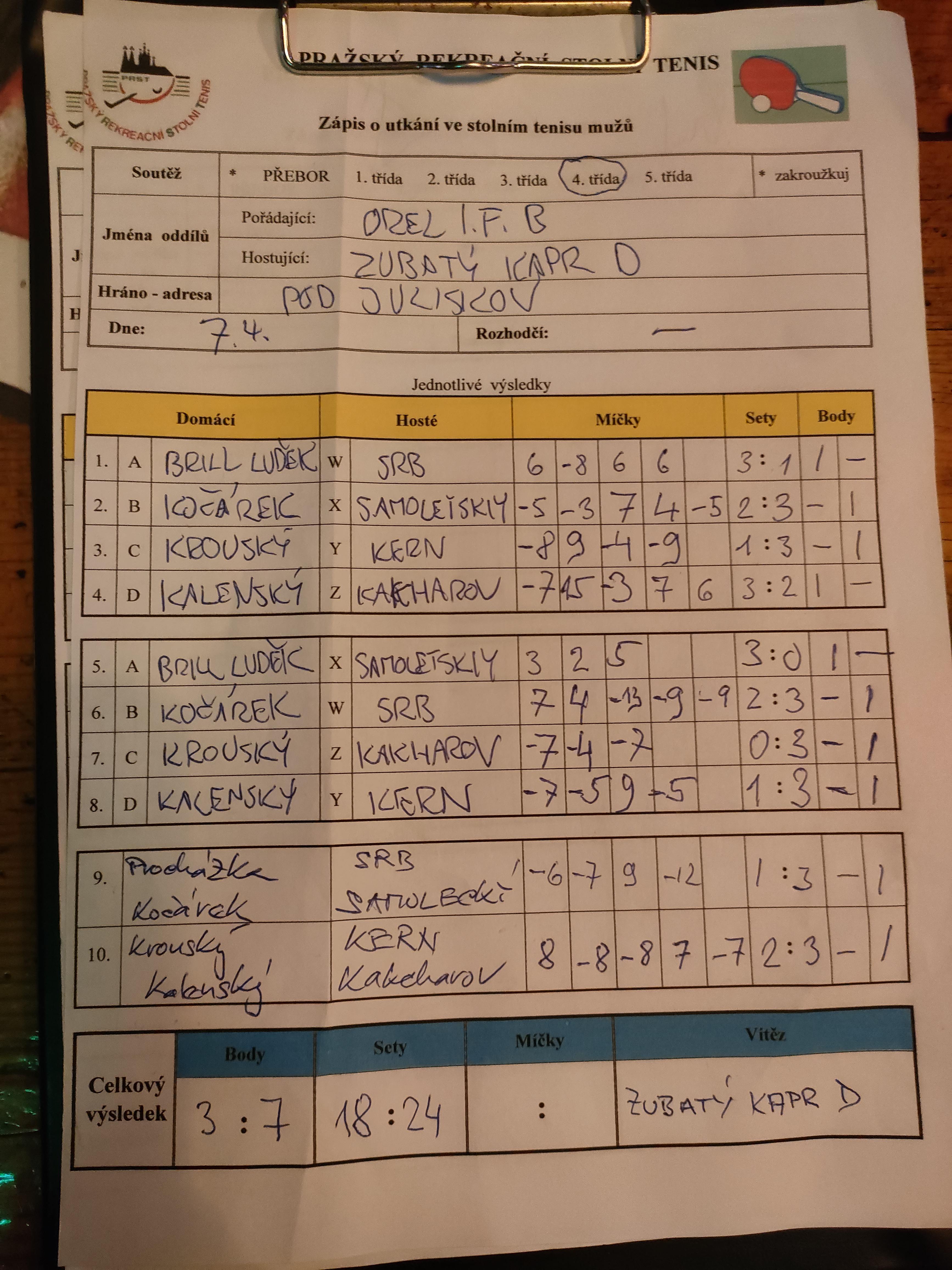 | 24/4 | Zubatý kapr D | Attila D | 6 : 4 | čt 02.04.2026 20:00 | | | 03.04.2026 07:52 odivis |
