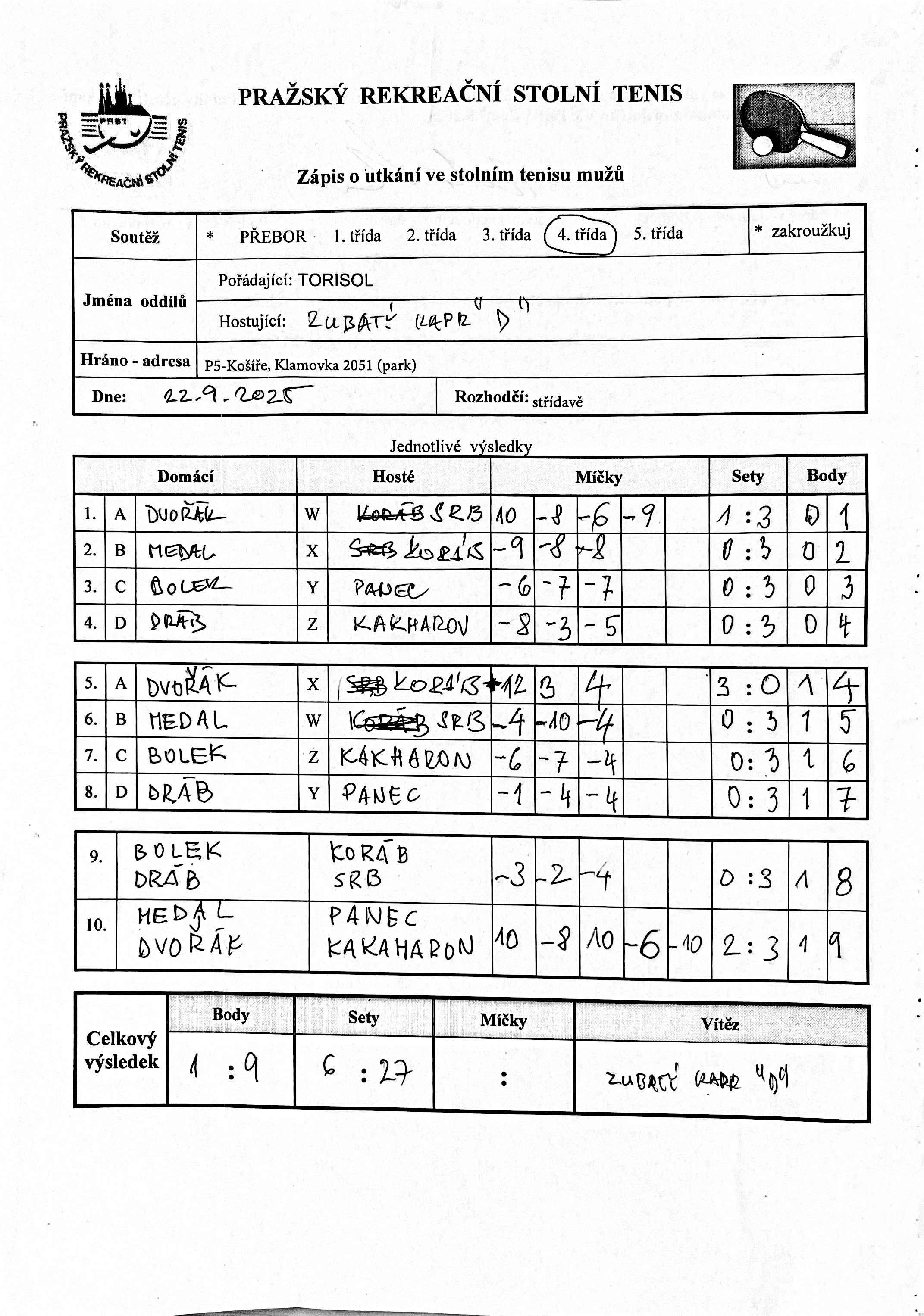 | 4/7 | DDM Praha 10 C | Zubatý kapr D | 3 : 7 | čt 09.10.2025 20:00 | | | 10.10.2025 09:41 cermra |