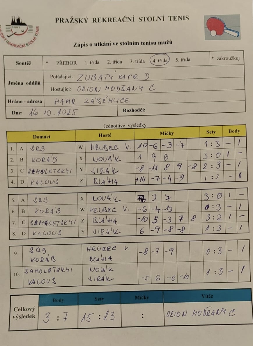 | 5/1 | Zubatý kapr D | Orion Modřany C | 3 : 7 | čt 16.10.2025 20:00 | | | 17.10.2025 10:00 odivis |