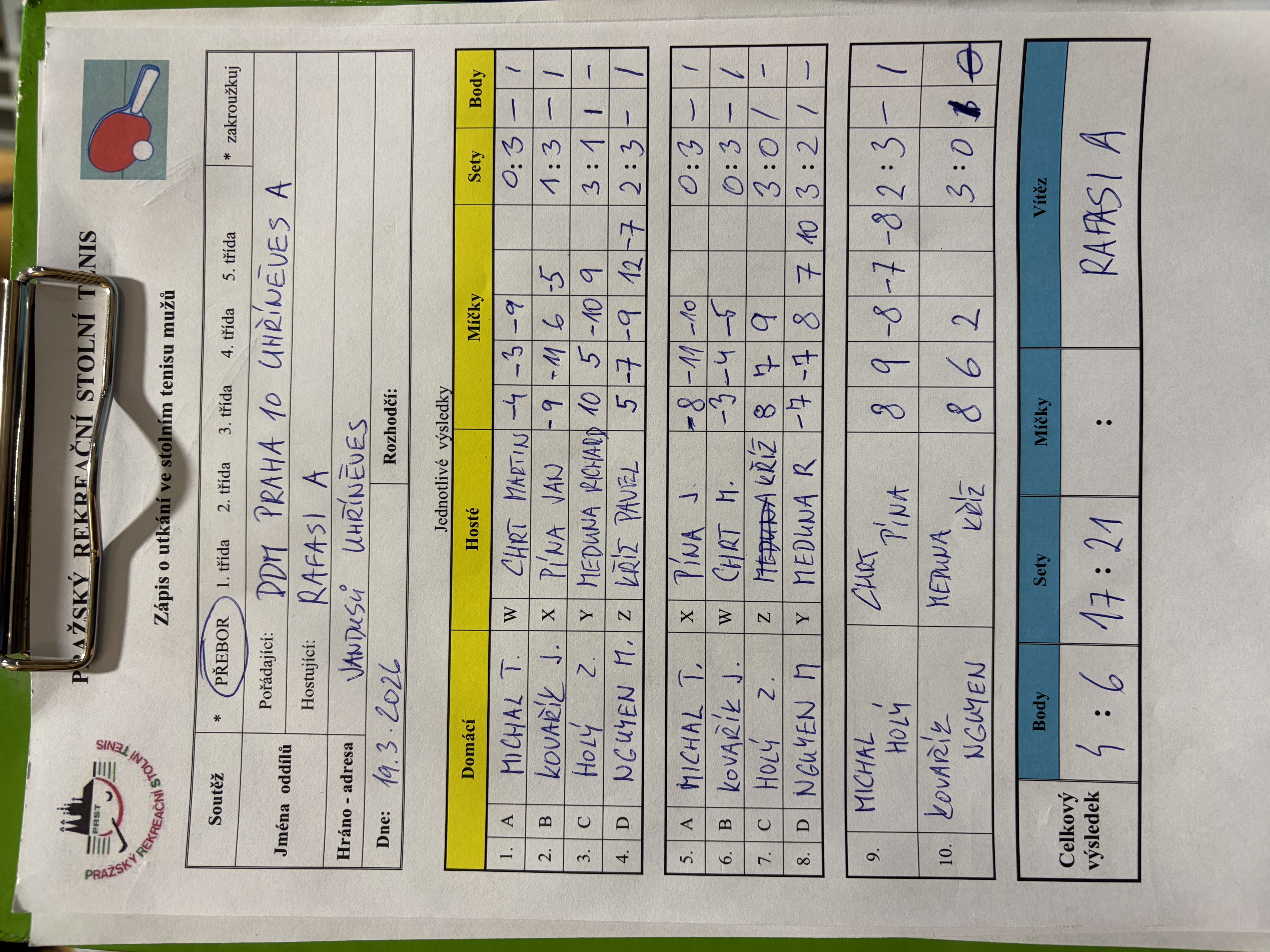 | 16/5 | DDM Praha 10 A | RAFASI A | 4 : 6 | čt 19.03.2026 20:00 | | | 19.03.2026 22:28 jaromi |