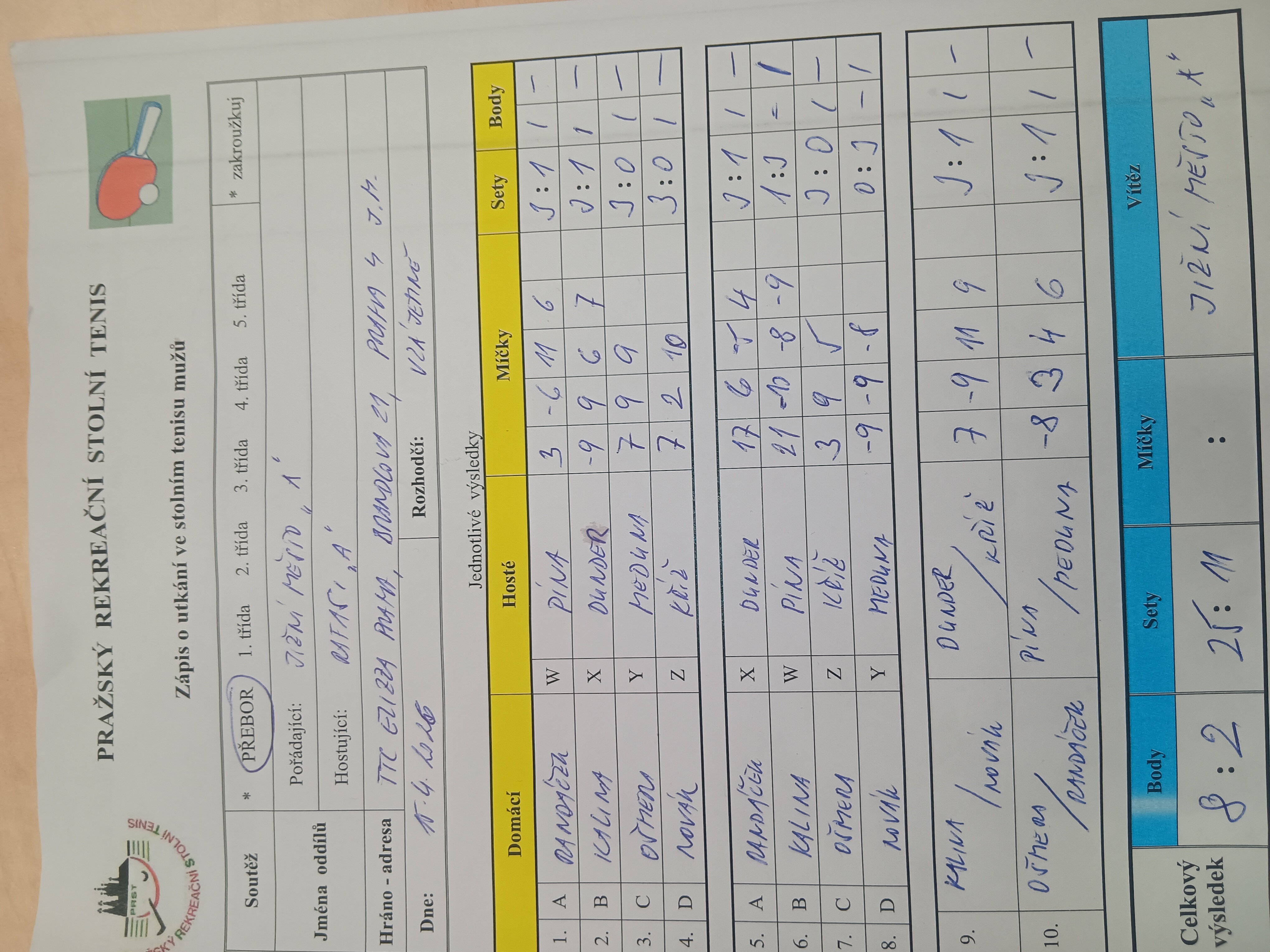 | 21/4 | Slivenec A | Jižní Město A | 4 : 6 | čt 02.04.2026 18:00 | | | 02.04.2026 22:38 radek. |
