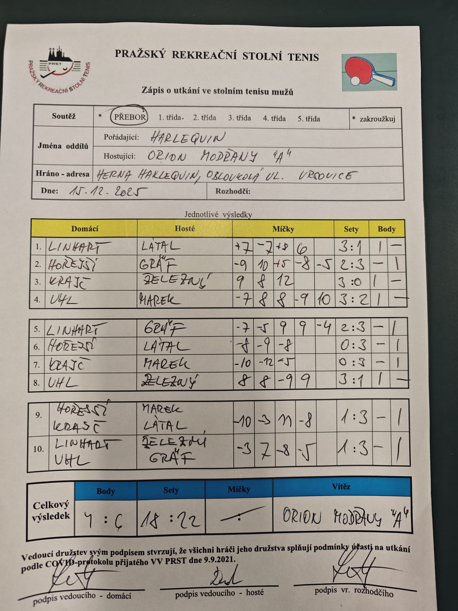 | 11/1 | Harlequin | Orion Modřany A | 4 : 6 | po 15.12.2025 20:00 | | | 15.12.2025 23:02 ivan |