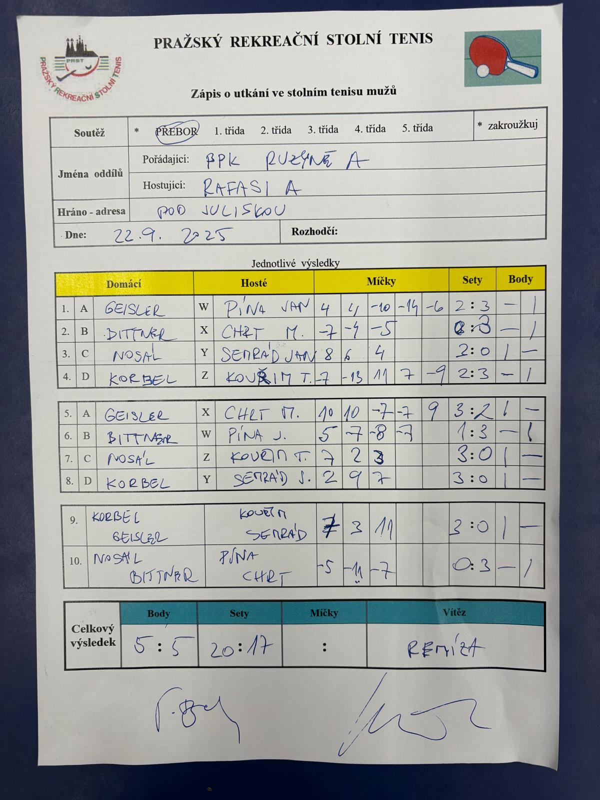 | 2/1 | PPK Ruzyně A | RAFASI A | 5 : 5 | 22.09. - 25.09. | | | 25.09.2025 12:42 radek. |