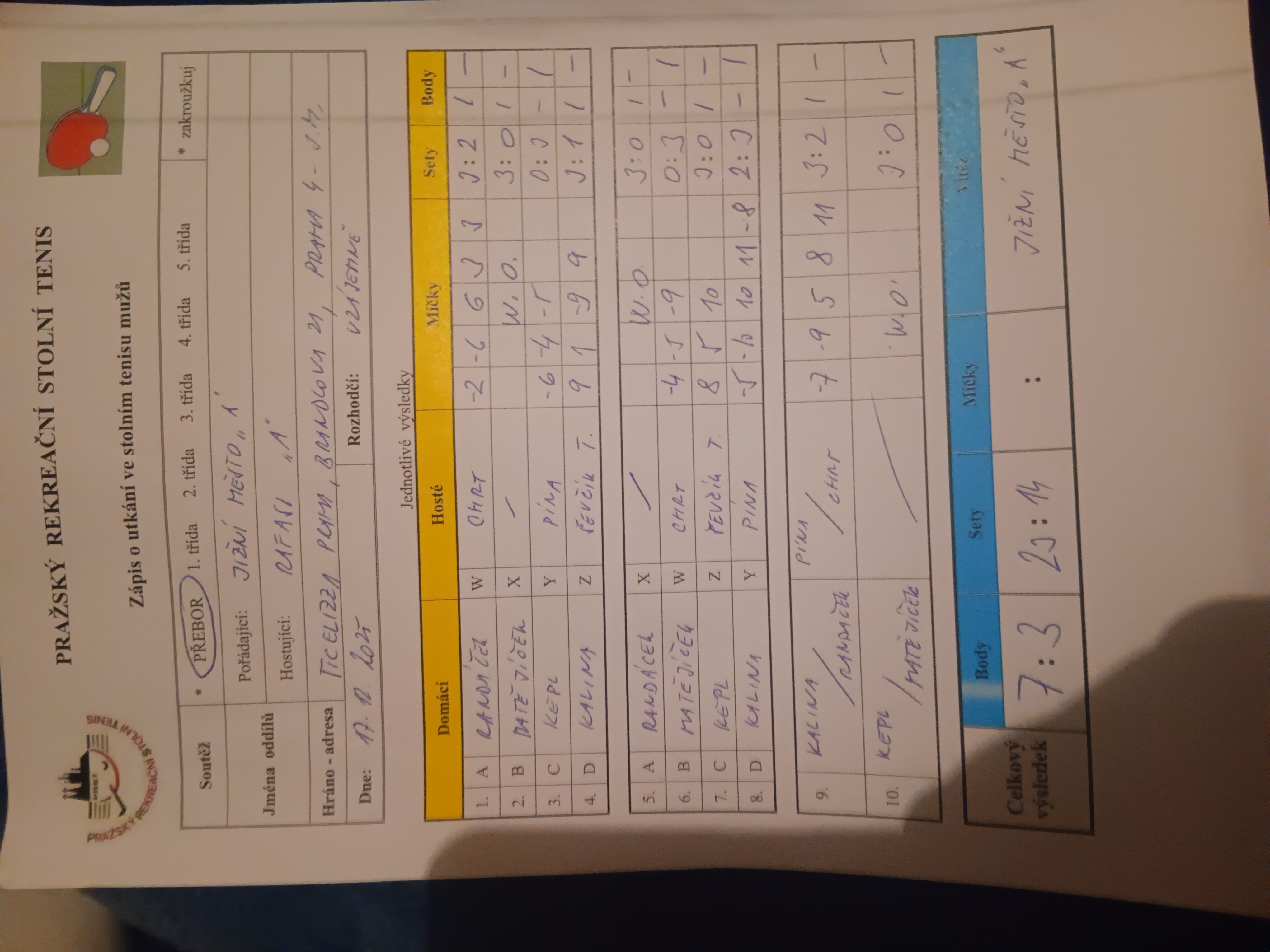 | 7/1 | RAFASI A | Orion Modřany A | 3 : 7 | út 04.11.2025 20:00 | | | 05.11.2025 08:53 tom.se |