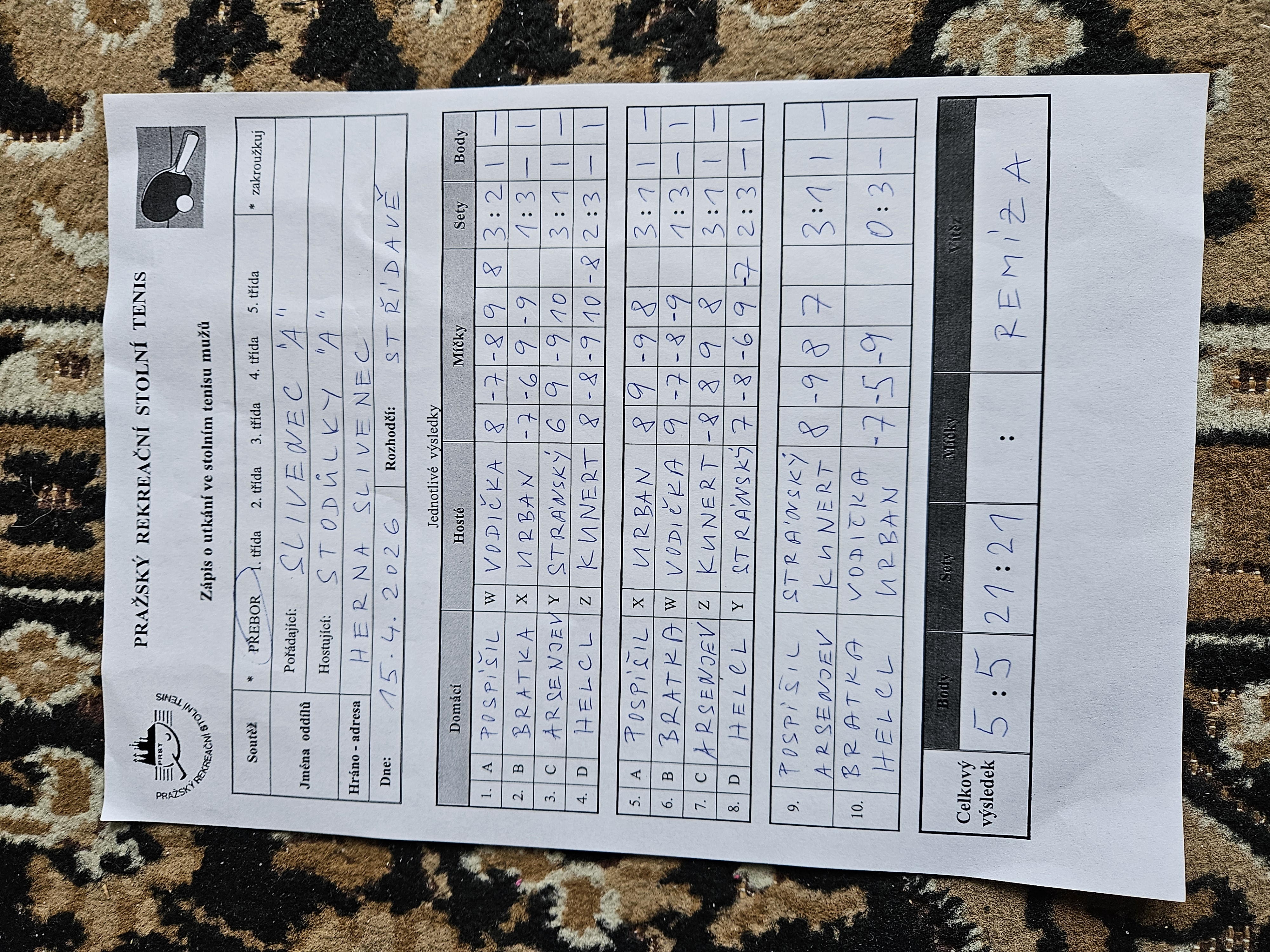 | 20/2 | Stodůlky A | Slivenec A | 5 : 5 | st 15.04.2026 18:00 | | | 16.04.2026 12:37 radek. |